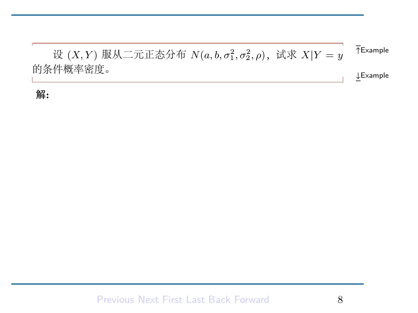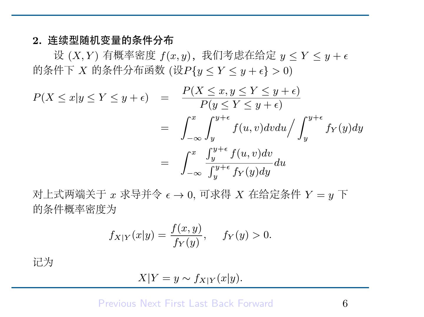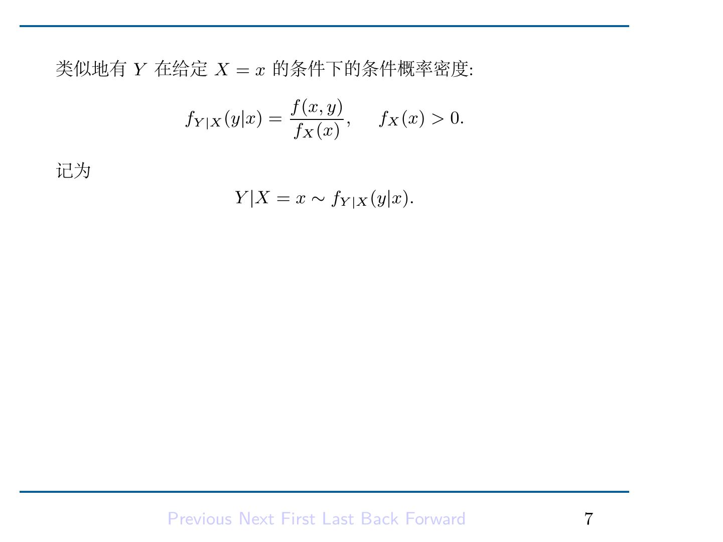 9 .类似地有 Y 在给定 X = x 的条件下的条件概率密度: f (x, y) fY |X (y|x) = , fX (x) > 0. fX (x) 记为 Y |X = x ∼ fY |X (y|x). Previous Next First Last Back Forward 7