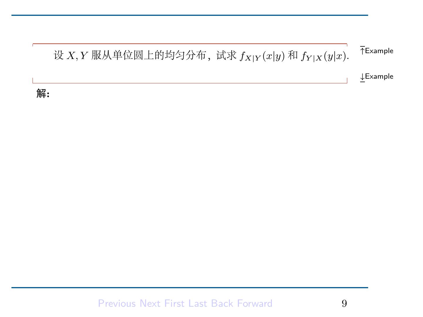 11 . ↑Example 设 X, Y 服从单位圆上的均匀分布,试求 fX|Y (x|y) 和 fY |X (y|x). ↓Example 解: 由题设知 (X, Y ) 的联合概率密度为 { 1 π , x2 + y 2 ≤ 1 f (x, y) = 0, 其它 易知 { √ 2 π 1 − x2 , −1 ≤ x ≤ 1 fX (x) = 0, 其它 所以 √ √ √1 , − 1 − y2 ≤ x ≤ 1 − y2 fX|Y (x|y) = 2 1−y 2 0, 其它 只需要把 x, y 互换,就可以得到 fY |X (y|x)。 Previous Next First Last Back Forward 9
