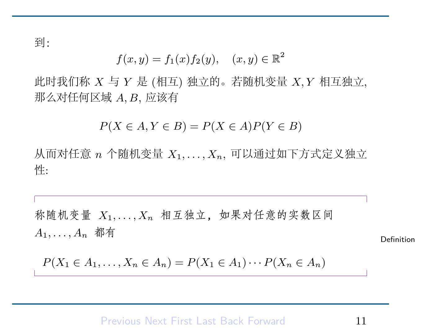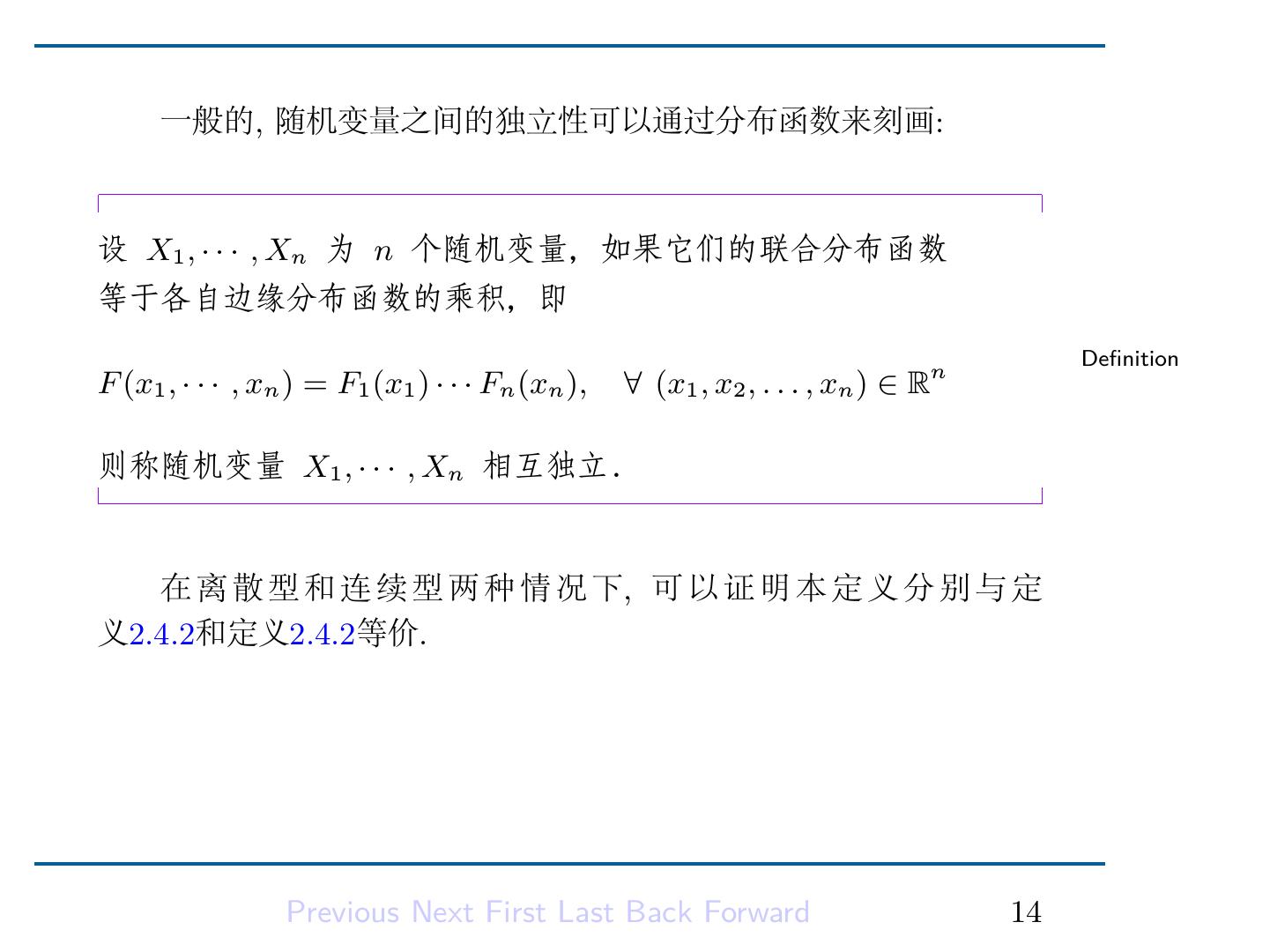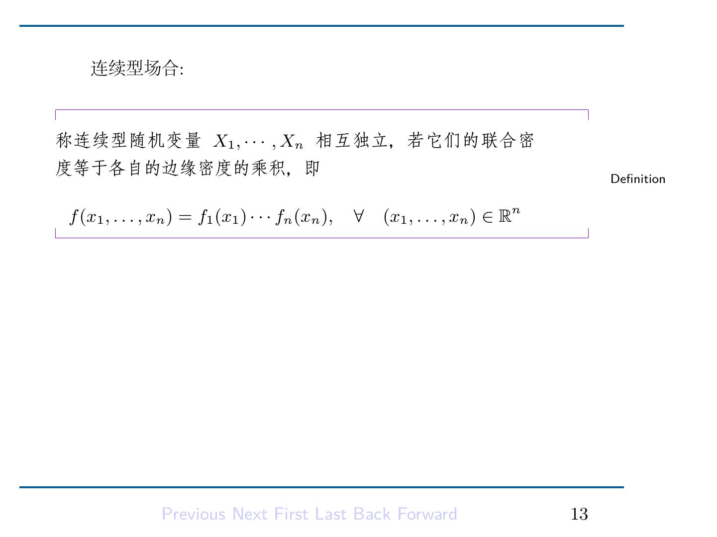 15 . 连续型场合: 称连续型随机变量 X1 , · · · , Xn 相互独立,若它们的联合密 度等于各自的边缘密度的乘积,即 Definition f (x1 , . . . , xn ) = f1 (x1 ) · · · fn (xn ), ∀ (x1 , . . . , xn ) ∈ Rn Previous Next First Last Back Forward 13
