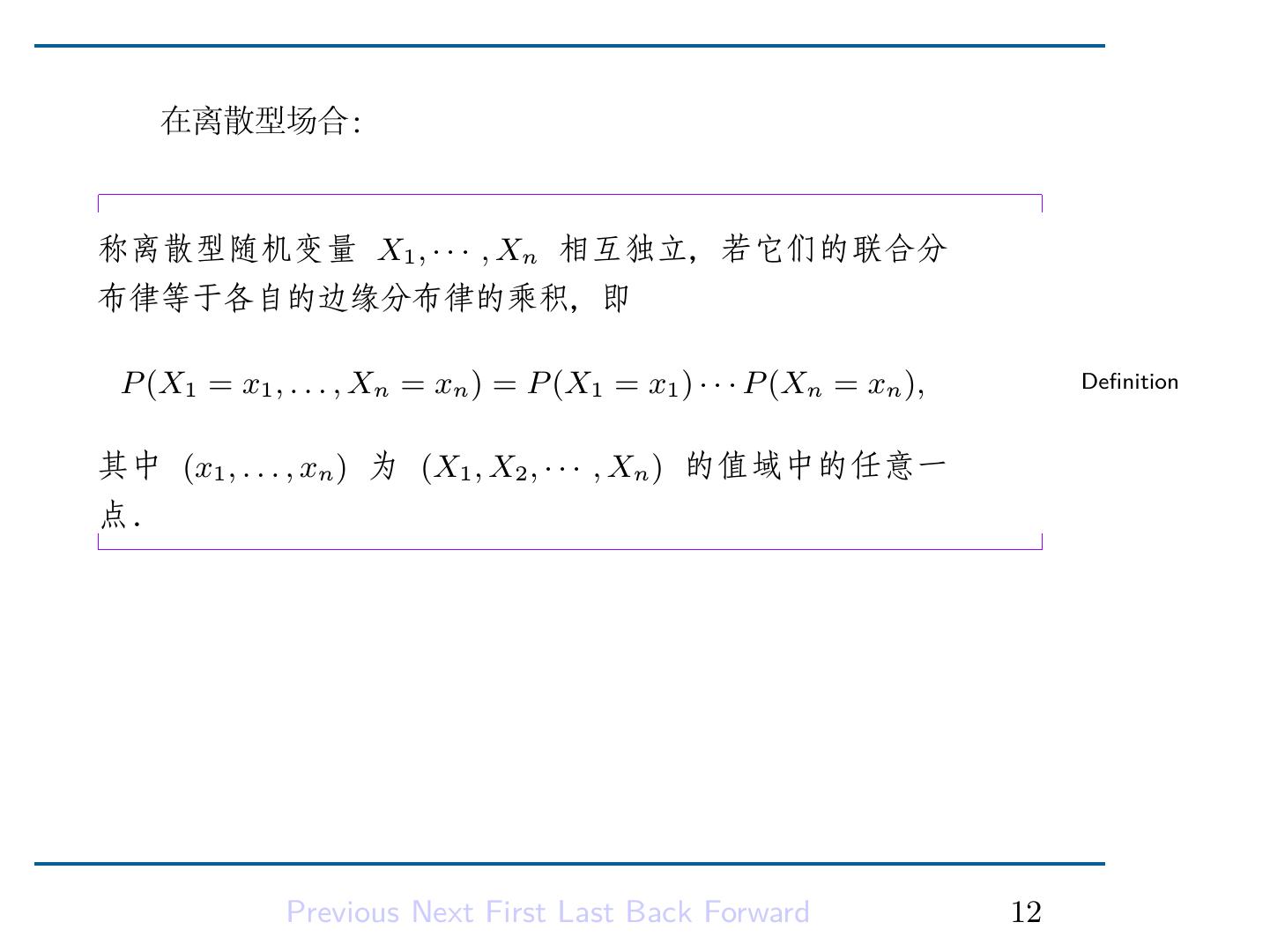 14 . 在离散型场合: 称离散型随机变量 X1 , · · · , Xn 相互独立,若它们的联合分 布律等于各自的边缘分布律的乘积,即 P (X1 = x1 , . . . , Xn = xn ) = P (X1 = x1 ) · · · P (Xn = xn ), Definition 其中 (x1 , . . . , xn ) 为 (X1 , X2 , · · · , Xn ) 的值域中的任意一 点. Previous Next First Last Back Forward 12
