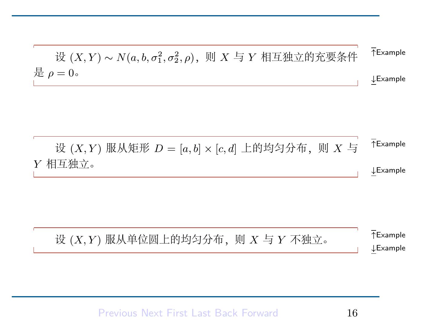 18 . ↑Example 设 (X, Y ) ∼ N (a, b, σ12 , σ22 , ρ),则 X 与 Y 相互独立的充要条件 是 ρ = 0。 ↓Example ↑Example 设 (X, Y ) 服从矩形 D = [a, b] × [c, d] 上的均匀分布,则 X 与 Y 相互独立。 ↓Example ↑Example 设 (X, Y ) 服从单位圆上的均匀分布,则 X 与 Y 不独立。 ↓Example Previous Next First Last Back Forward 16
