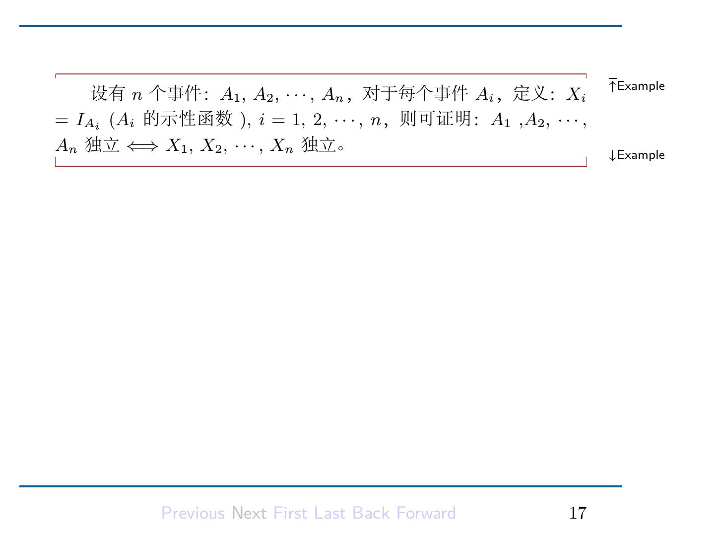19 . ↑Example 设有 n 个事件:A1 , A2 , · · · , An ,对于每个事件 Ai ,定义:Xi = IAi (Ai 的示性函数 ), i = 1, 2, · · · , n,则可证明:A1 ,A2 , · · · , An 独立 ⇐⇒ X1 , X2 , · · · , Xn 独立。 ↓Example Previous Next First Last Back Forward 17