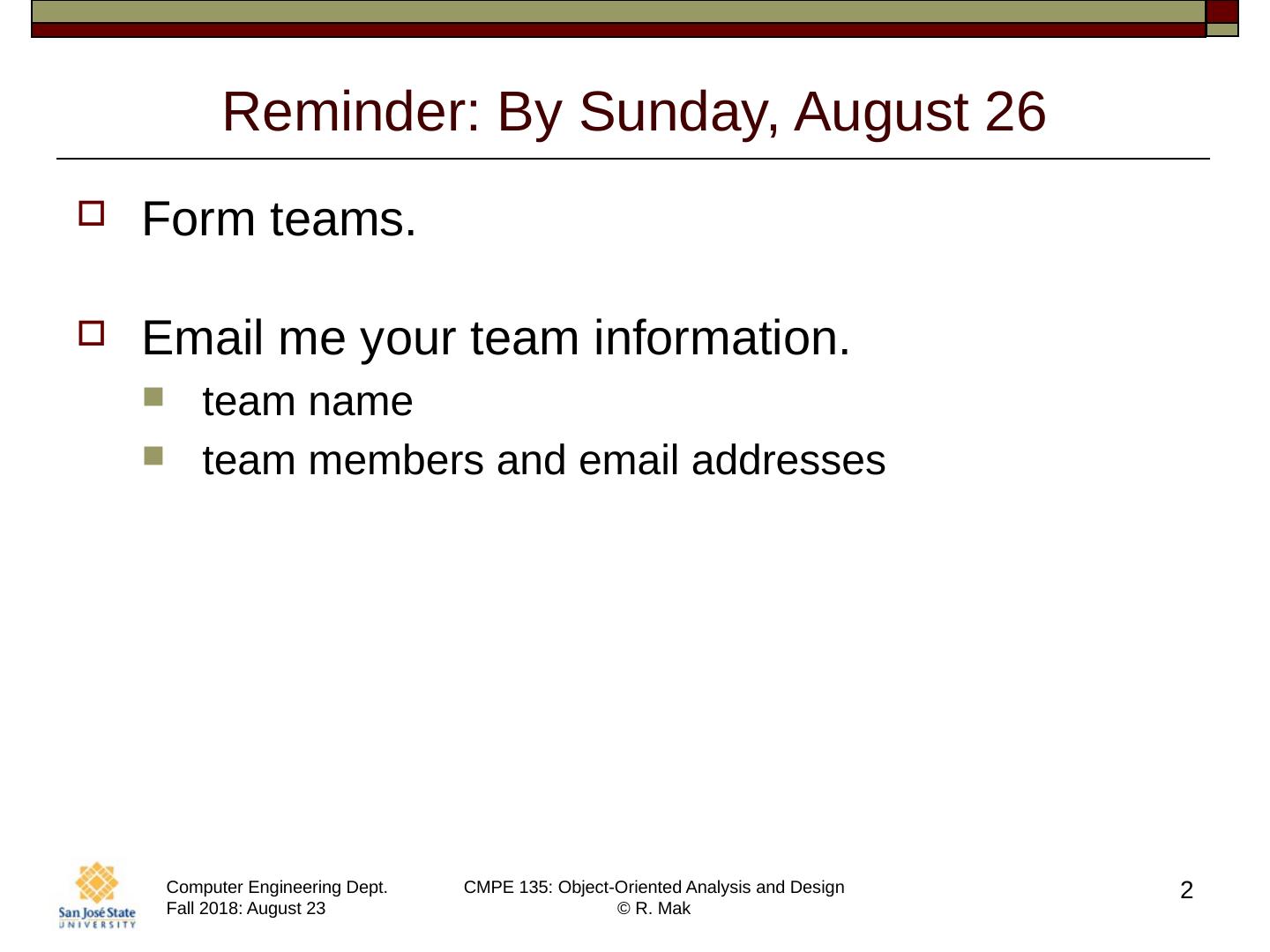 2 .Reminder: By Sunday, August 26 Form teams. Email me your team information. team name team members and email addresses 2
