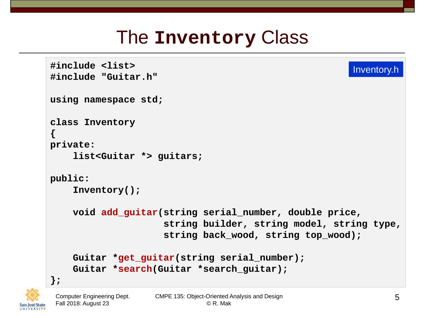 5 .5 The Inventory Class #include <list> #include " Guitar.h " using namespace std ; class Inventory { private: list<Guitar *> guitars; public: Inventory(); void add_guitar (string serial_number , double price, string builder, string model, string type, string back_wood , string top_wood ); Guitar * get_guitar (string serial_number ); Guitar * search (Guitar * search_guitar ); }; Inventory.h