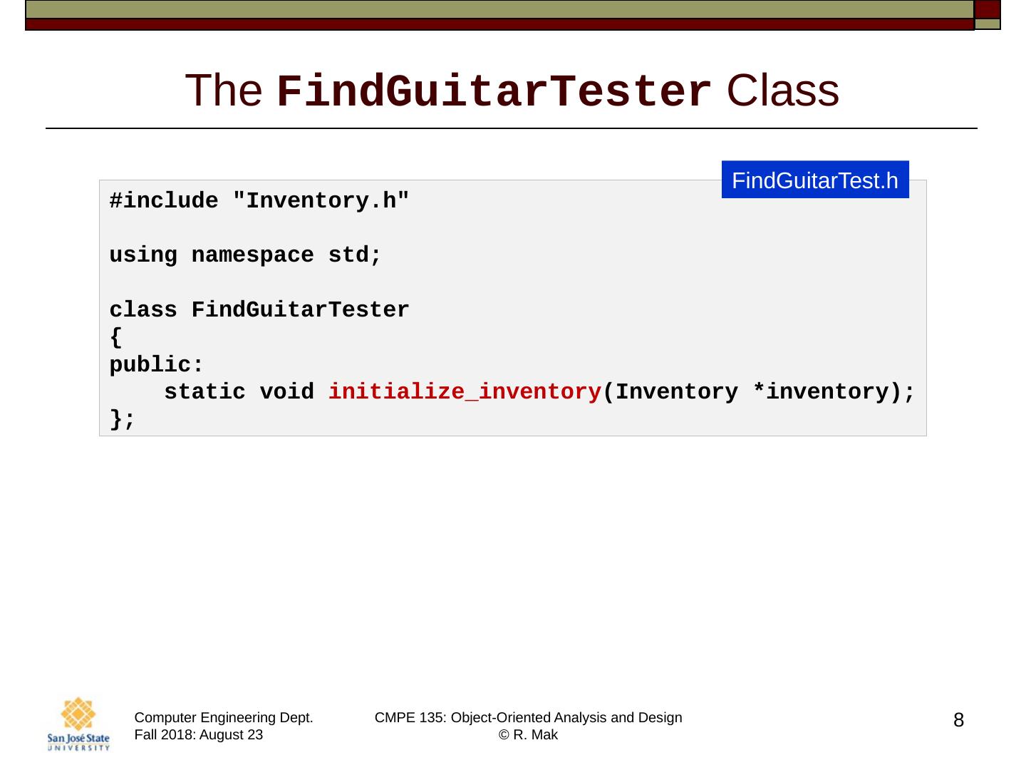 8 .The FindGuitarTester Class 8 #include " Inventory.h " using namespace std ; class FindGuitarTester { public: static void initialize_inventory (Inventory *inventory); }; FindGuitarTest.h