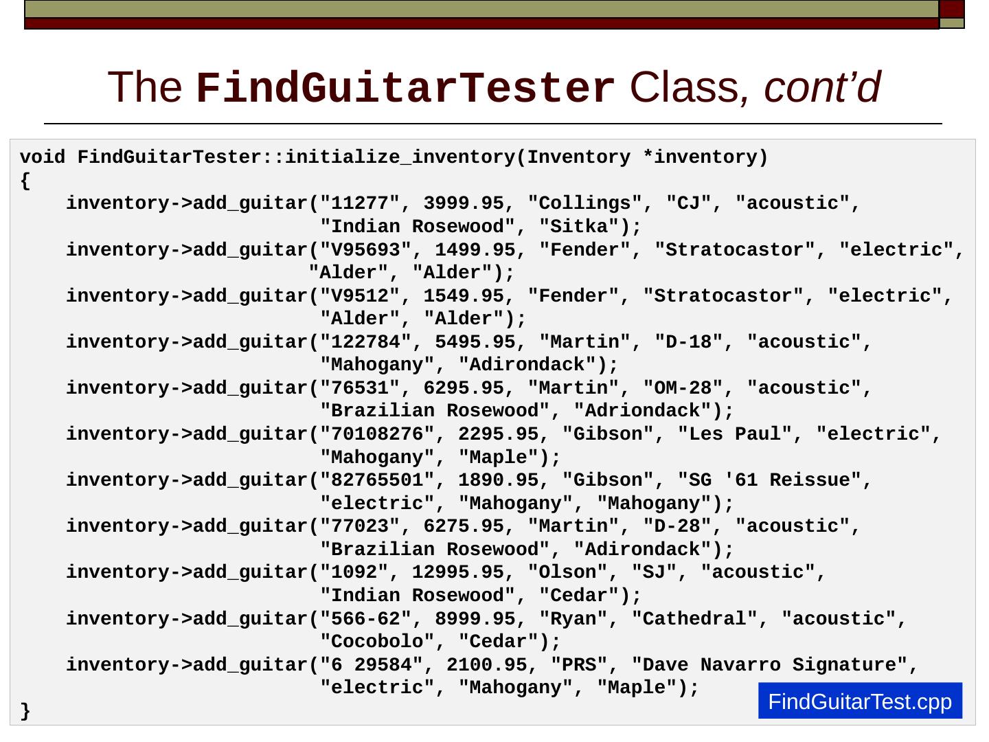 6 .6 The Inventory Class , cont’d void Inventory:: add_guitar (string serial_number , double price, string builder, string model, string type, string back_wood , string top_wood ) { Guitar *guitar = new Guitar( serial_number , price, builder, model, type, back_wood , top_wood ); guitars.push_back (guitar); } Guitar *Inventory:: get_guitar (string serial_number ) { list<Guitar *>::iterator it; for (it = guitars.begin (); it != guitars.end (); it++) { Guitar *guitar = *it; if (guitar-> get_serial_number () == serial_number ) return *it; } return nullptr ; } Inventory.cpp