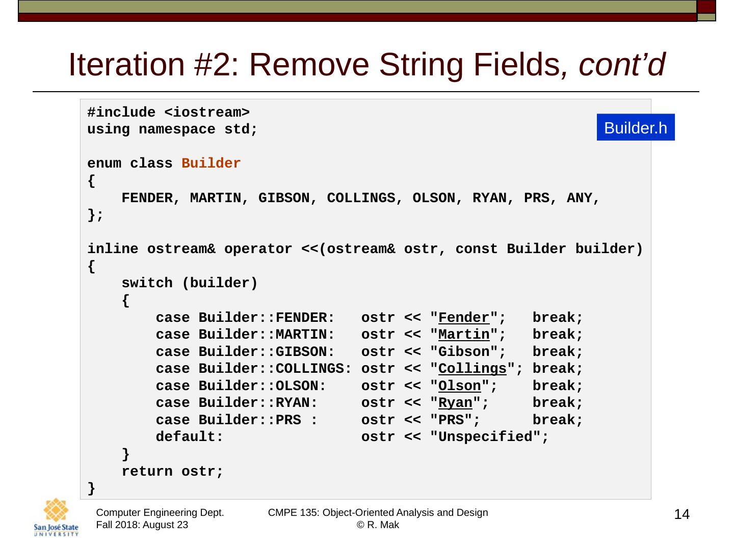 14 .14 Iteration #2: Remove String Fields , cont’d #include <iostream> using namespace std ; enum class Builder { FENDER, MARTIN, GIBSON, COLLINGS, OLSON, RYAN, PRS, ANY, }; inline ostream & operator <<( ostream & ostr , const Builder builder) { switch (builder) { case Builder::FENDER: ostr << " Fender "; break; case Builder::MARTIN: ostr << " Martin "; break; case Builder::GIBSON: ostr << "Gibson"; break; case Builder::COLLINGS: ostr << " Collings "; break; case Builder::OLSON: ostr << " Olson "; break; case Builder::RYAN: ostr << " Ryan "; break; case Builder::PRS : ostr << "PRS"; break; default: ostr << "Unspecified"; } return ostr ; } Builder.h