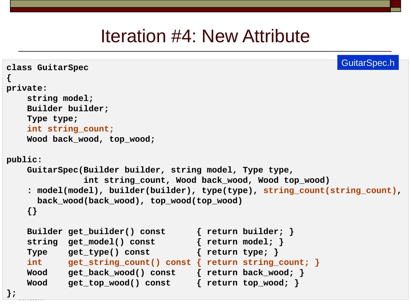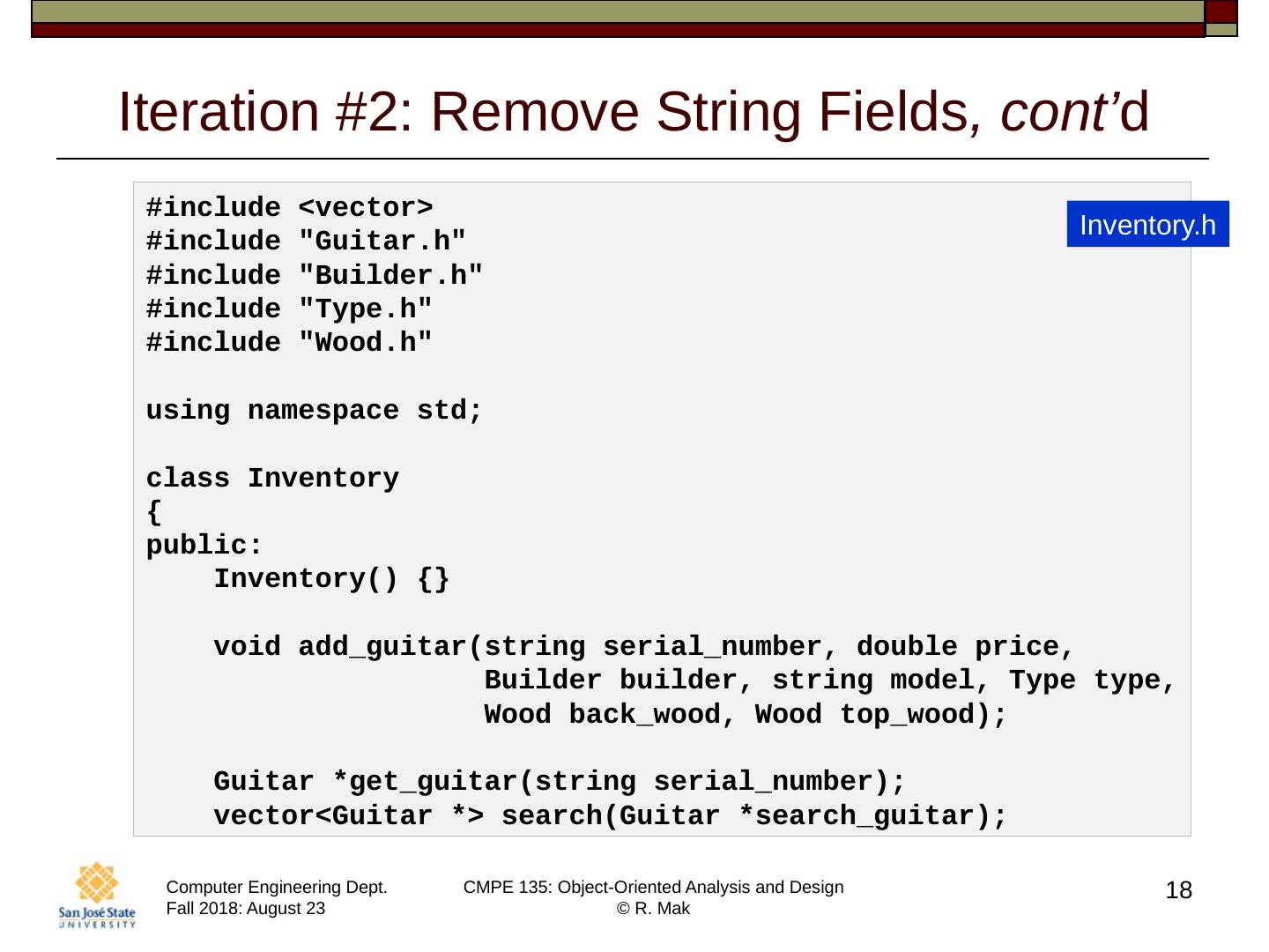 17 .Iteration #2: Remove String Fields , cont’ d 17 class Guitar { private: string serial_number , model; double price; Builder builder; Type type; Wood back_wood , top_wood ; public: Guitar(string serial_number , double price, Builder builder, string model, Type type, Wood back_wood , Wood top_wood ) : serial_number ( serial_number ), model(model), price(price), builder(builder), type(type), back_wood ( back_wood ), top_wood ( top_wood ) {} string get_serial_number () const { return serial_number ; } double get_price () const { return price; } void set_price (float new_price ) { price = new_price ; } Builder get_builder () const { return builder; } string get_model () const { return model; } Type get_type () const { return type; } Wood get_back_wood () const { return back_wood ; } Wood get_top_wood () const { return top_wood ; } }; Guitar.h