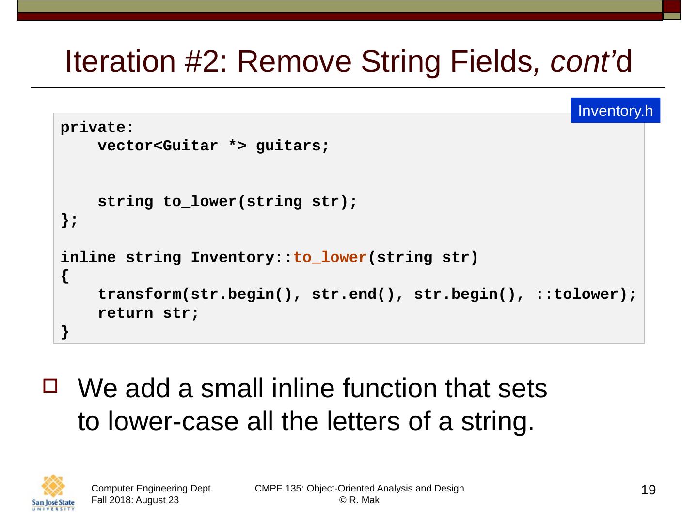 19 .Iteration #2: Remove String Fields , cont’ d 19 private: vector<Guitar *> guitars; string to_lower (string str ); }; inline string Inventory:: to_lower (string str ) { transform( str.begin (), str.end (), str.begin (), :: tolower ); return str ; } Inventory.h We add a small inline function that sets to lower-case all the letters of a string.