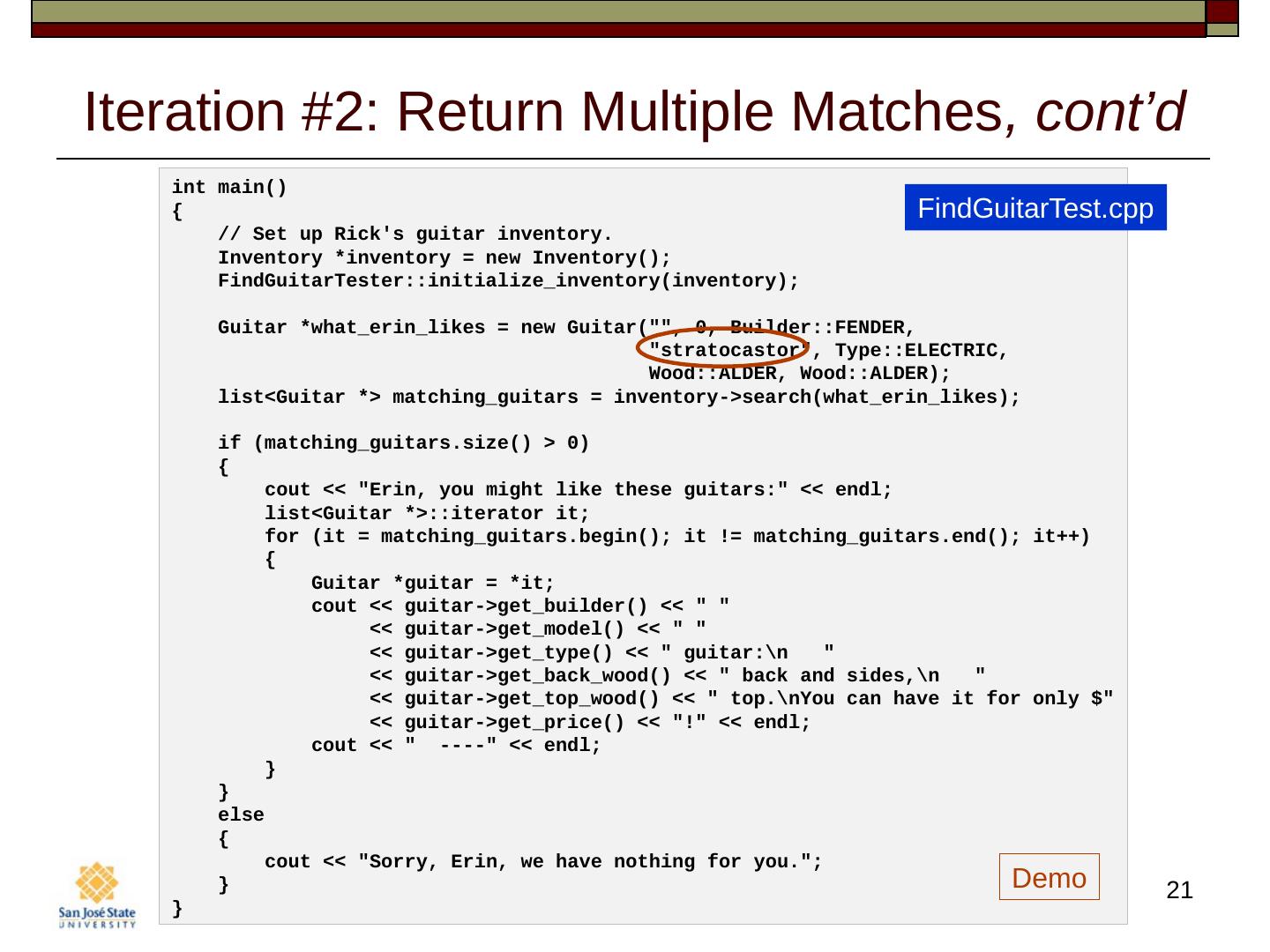 20 .Iteration #2: Return Multiple Matches 20 list<Guitar *> Inventory::search(Guitar * search_guitar ) { list<Guitar *> matching_guitars ; list<Guitar *>::iterator it; for (it = guitars.begin (); it != guitars.end (); it++) { Guitar *guitar = *it; Builder builder = search_guitar -> get_builder (); if (builder != guitar-> get_builder ()) continue; if ( to_lower ( search_guitar -> get_model ()) != to_lower (guitar-> get_model ())) continue; Type type = search_guitar -> get_type (); if (type != guitar-> get_type ()) continue; Wood back_wood = search_guitar -> get_back_wood (); if ( back_wood != guitar-> get_back_wood ()) continue; Wood top_wood = search_guitar -> get_top_wood (); if ( top_wood != guitar-> get_top_wood ()) continue; matching_guitars.push_back (guitar); } return matching_guitars ; } Inventory.cpp