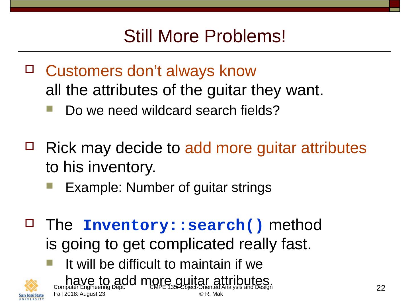 22 .22 Still More Problems! Customers don’t always know all the attributes of the guitar they want. Do we need wildcard search fields? Rick may decide to add more guitar attributes to his inventory. Example: Number of guitar strings The Inventory::search() method is going to get complicated really fast. It will be difficult to maintain if we have to add more guitar attributes.