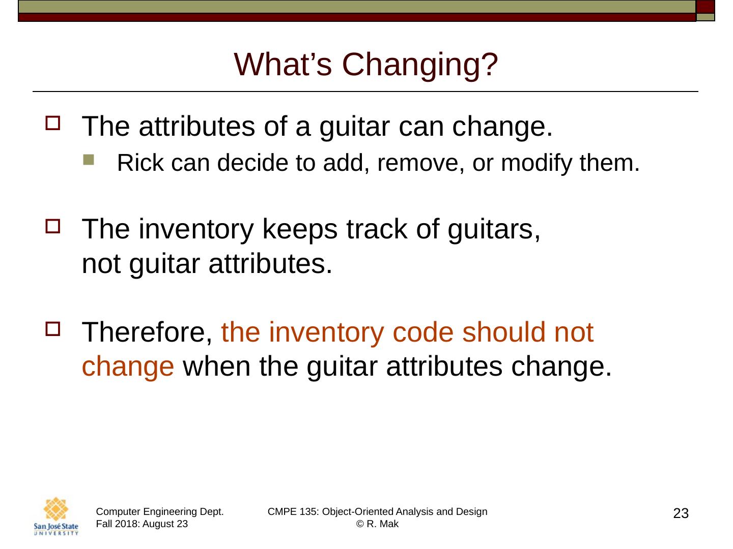 23 .23 What’s Changing? The attributes of a guitar can change. Rick can decide to add, remove, or modify them. The inventory keeps track of guitars, not guitar attributes. Therefore, the inventory code should not change when the guitar attributes change.