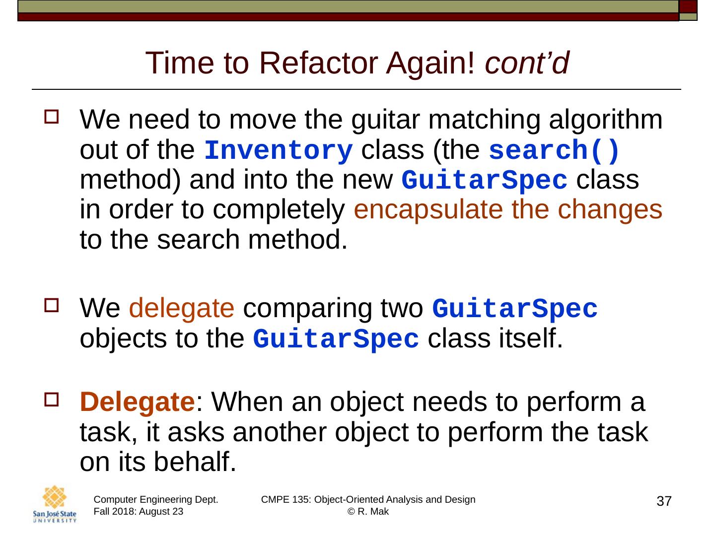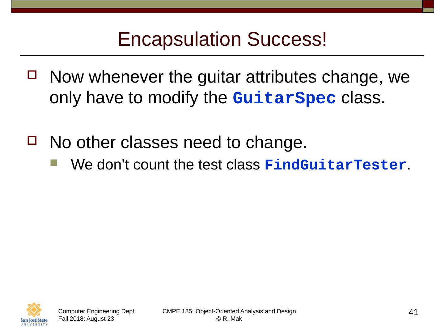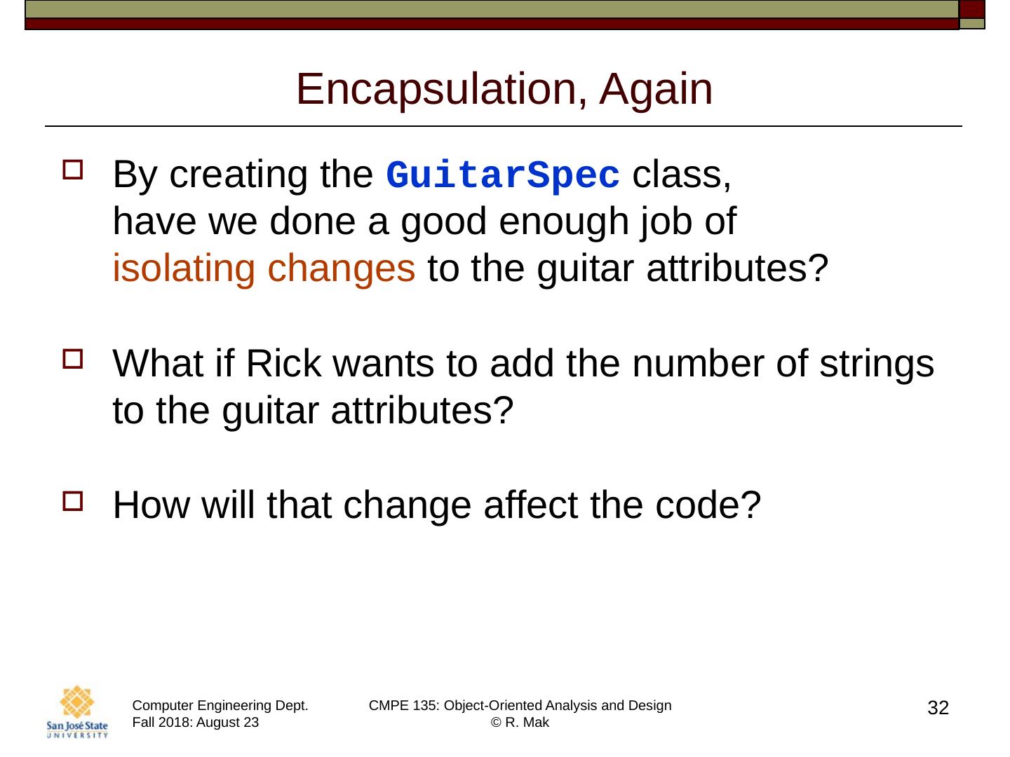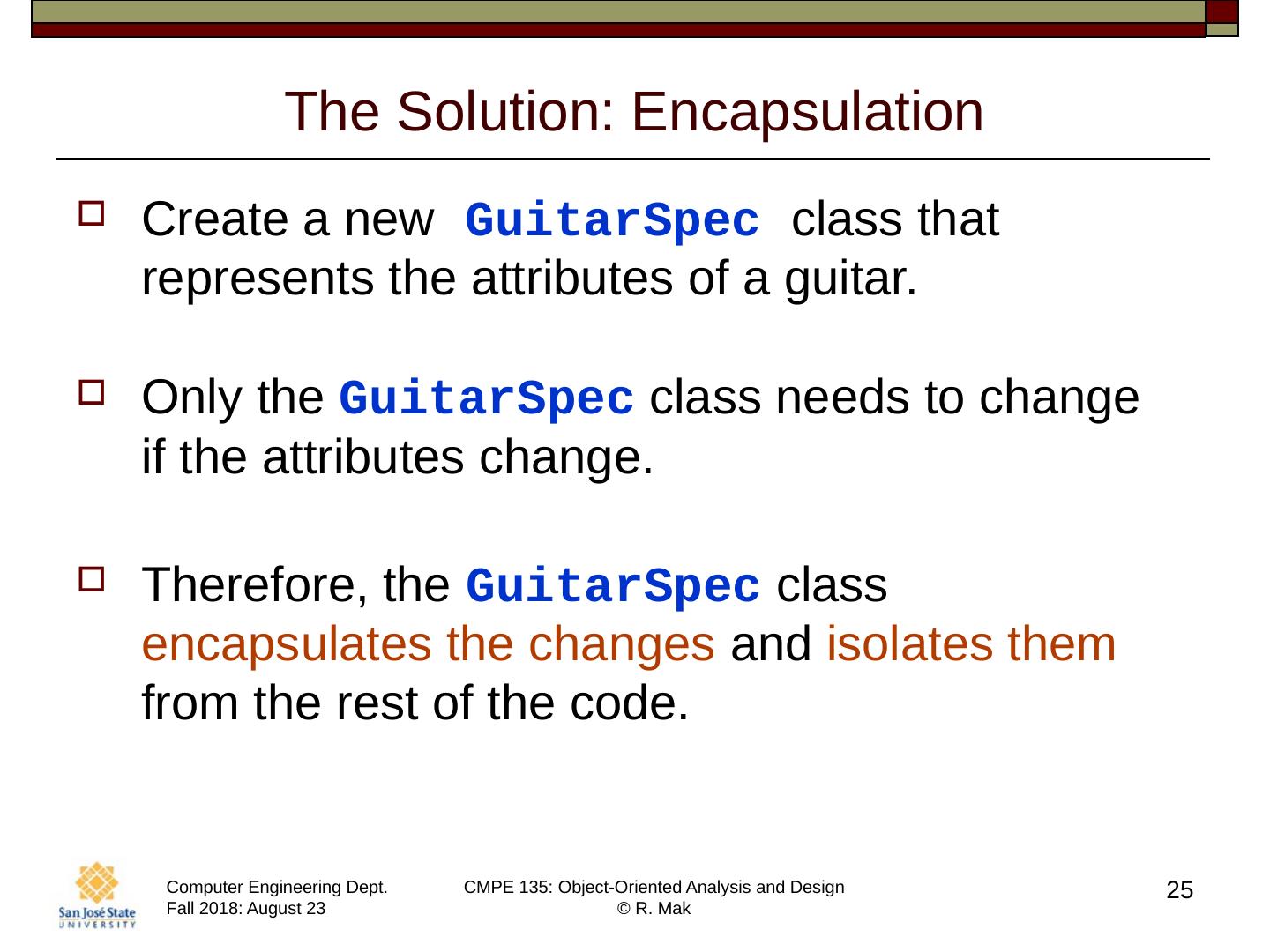 25 .25 The Solution: Encapsulation Create a new GuitarSpec class that represents the attributes of a guitar. Only the GuitarSpec class needs to change if the attributes change. Therefore, the GuitarSpec class encapsulates the changes and isolates them from the rest of the code.