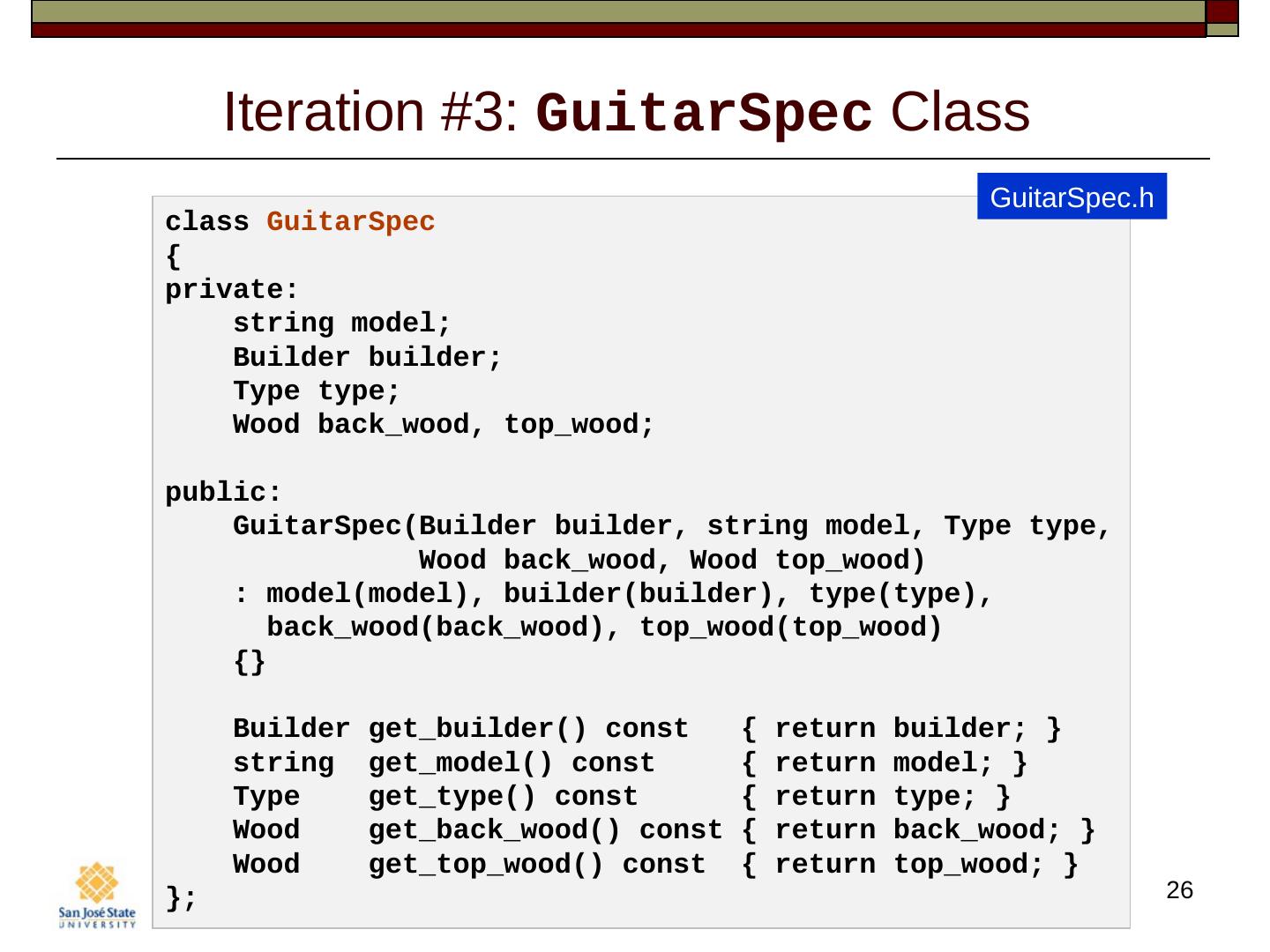 26 .26 Iteration #3: GuitarSpec Class class GuitarSpec { private: string model; Builder builder; Type type; Wood back_wood , top_wood ; public: GuitarSpec (Builder builder, string model, Type type, Wood back_wood , Wood top_wood ) : model(model), builder(builder), type(type), back_wood ( back_wood ), top_wood ( top_wood ) {} Builder get_builder () const { return builder; } string get_model () const { return model; } Type get_type () const { return type; } Wood get_back_wood () const { return back_wood ; } Wood get_top_wood () const { return top_wood ; } }; GuitarSpec.h