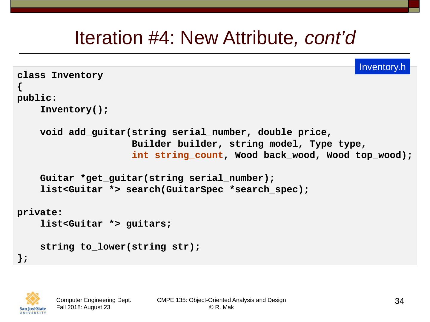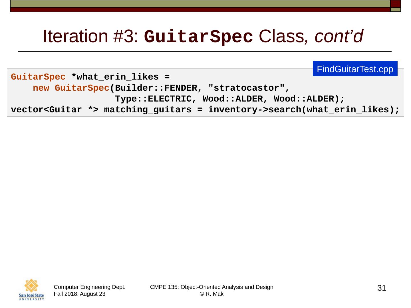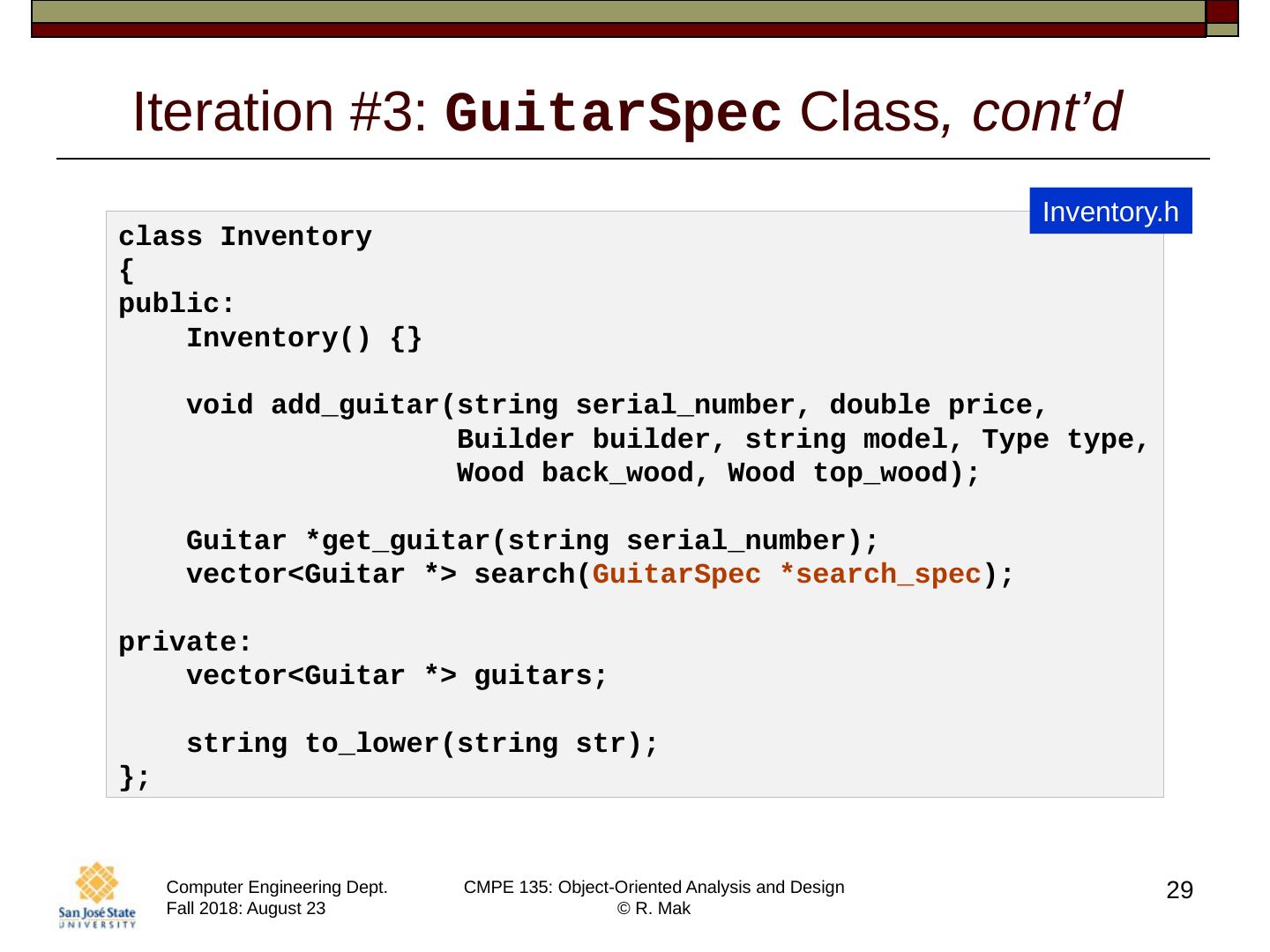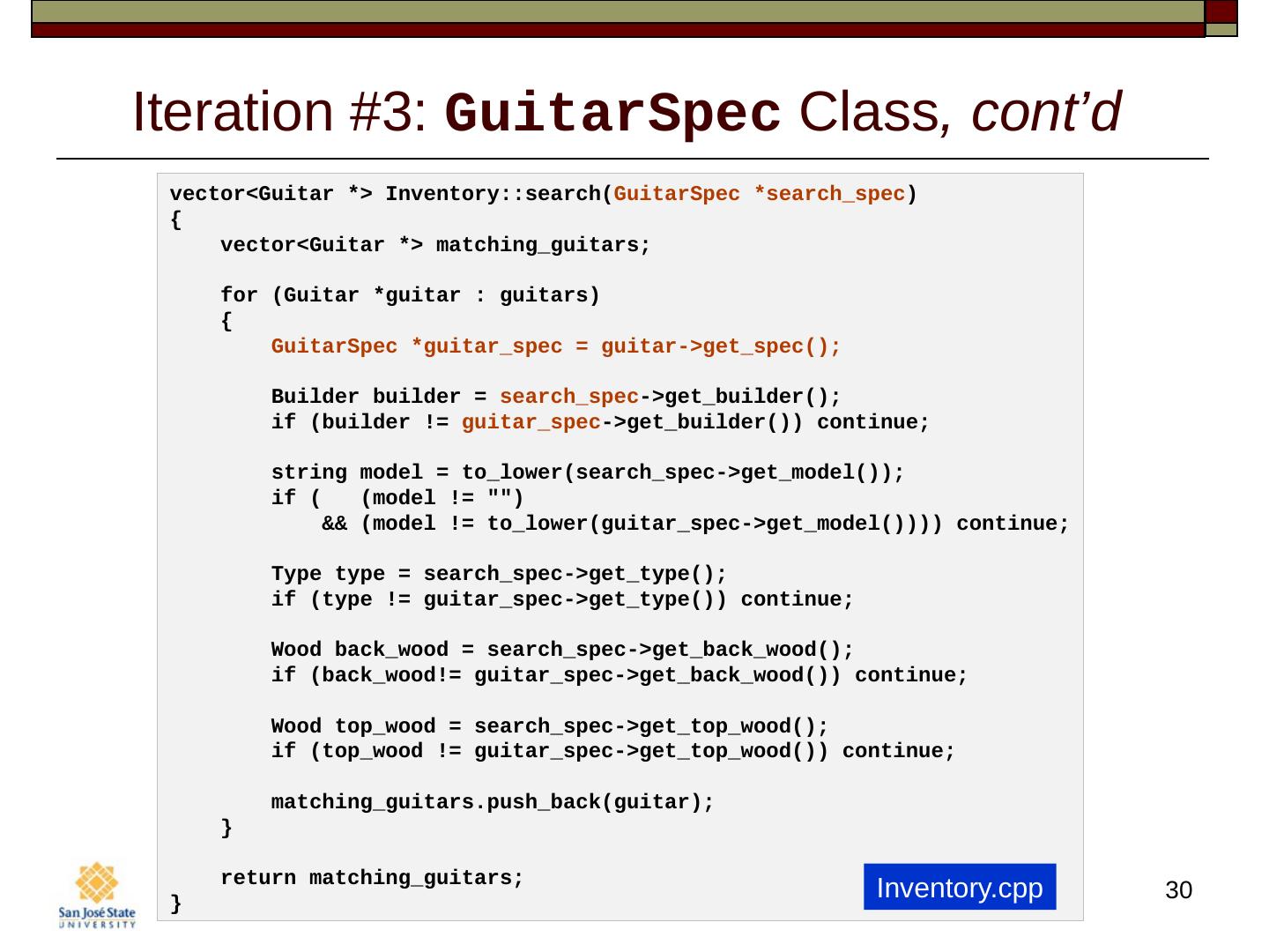 29 .Iteration #3: GuitarSpec Class , cont’d 29 class Inventory { public: Inventory() {} void add_guitar (string serial_number , double price, Builder builder, string model, Type type, Wood back_wood , Wood top_wood ); Guitar * get_guitar (string serial_number ); vector<Guitar *> search( GuitarSpec * search_spec ); private: vector<Guitar *> guitars; string to_lower (string str ); }; Inventory.h
