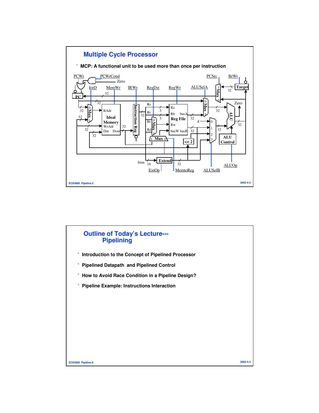 3 . Multiple Cycle Processor °MCP: A functional unit to be used more than once per instruction PCWr PCWrCond PCSrc BrWr Zero IorD MemWr IRWr RegDst RegWr ALUSelA 1 Target Mux 32 32 PC 0 0 32 Zero Mux Rs Instruction Reg 0 Ra Mux 32 RAdr Rt 5 32 ALU 32 Rb busA 1 32 Ideal 5 32 Reg File 1 Memory Rt 0 4 0 Mux WrAdr 32 Rw 32 32 Rd 1 32 Din Dout busW busB 32 1 2 32 ALU 1 Mux 0 3 << 2 Control Imm 16 Extend 32 ALUOp ExtOp MemtoReg ALUSelB ECE4680 Pipeline.5 2002-4-3 Outline of Today’s Lecture--- Pipelining °Introduction to the Concept of Pipelined Processor °Pipelined Datapath and Pipelined Control °How to Avoid Race Condition in a Pipeline Design? °Pipeline Example: Instructions Interaction ECE4680 Pipeline.6 2002-4-3