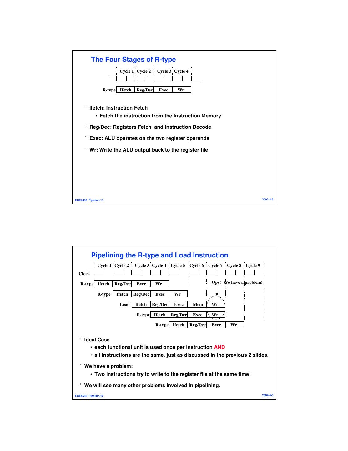 6 . The Four Stages of R-type Cycle 1 Cycle 2 Cycle 3 Cycle 4 R-type Ifetch Reg/Dec Exec Wr °Ifetch: Instruction Fetch • Fetch the instruction from the Instruction Memory °Reg/Dec: Registers Fetch and Instruction Decode °Exec: ALU operates on the two register operands °Wr: Write the ALU output back to the register file ECE4680 Pipeline.11 2002-4-3 Pipelining the R-type and Load Instruction Cycle 1 Cycle 2 Cycle 3 Cycle 4 Cycle 5 Cycle 6 Cycle 7 Cycle 8 Cycle 9 Clock R-type Ifetch Reg/Dec Exec Wr Ops! We have a problem! R-type Ifetch Reg/Dec Exec Wr Load Ifetch Reg/Dec Exec Mem Wr R-type Ifetch Reg/Dec Exec Wr R-type Ifetch Reg/Dec Exec Wr °Ideal Case • each functional unit is used once per instruction AND • all instructions are the same, just as discussed in the previous 2 slides. °We have a problem: • Two instructions try to write to the register file at the same time! °We will see many other problems involved in pipelining. ECE4680 Pipeline.12 2002-4-3