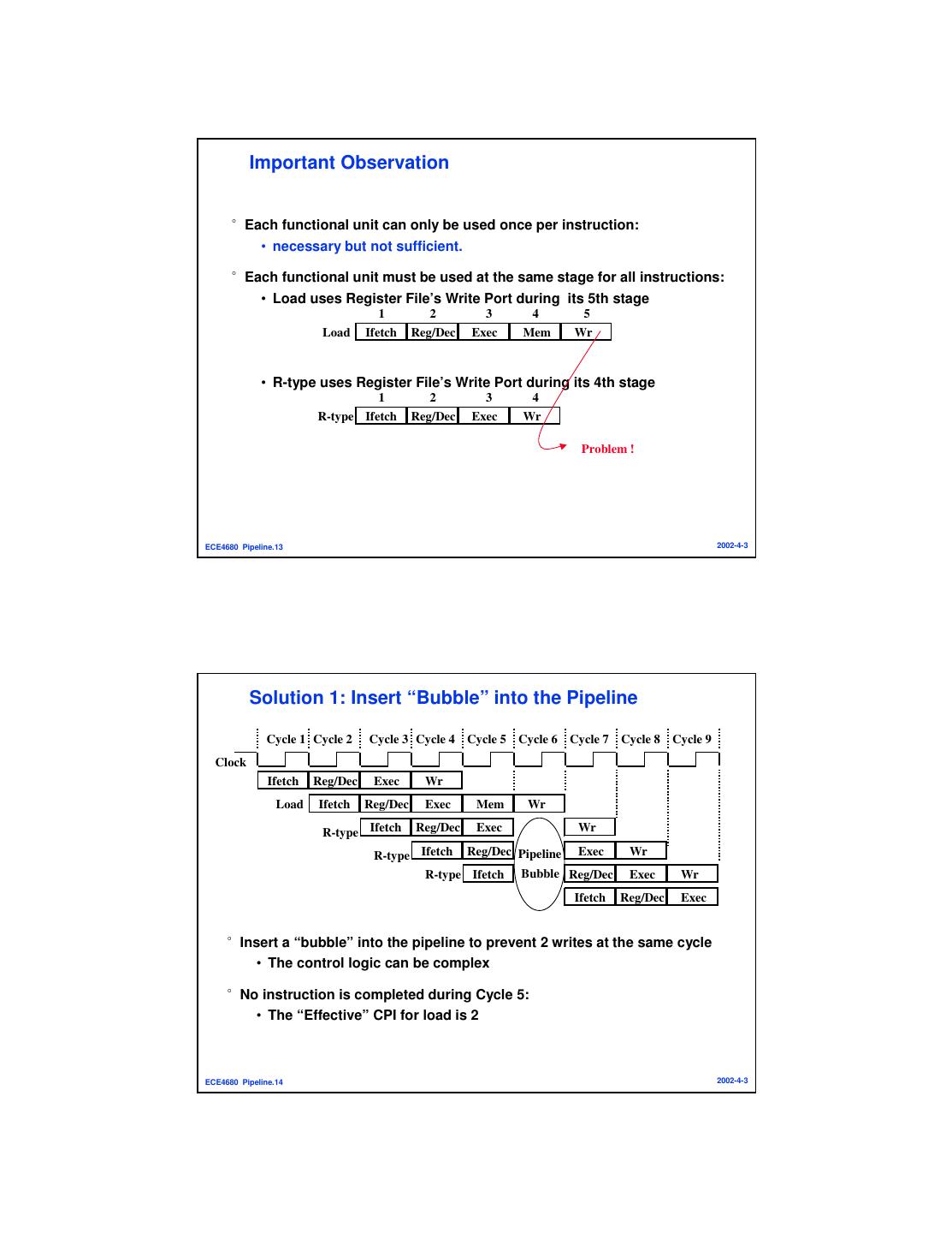7 . Important Observation °Each functional unit can only be used once per instruction: • necessary but not sufficient. °Each functional unit must be used at the same stage for all instructions: • Load uses Register File’s Write Port during its 5th stage 1 2 3 4 5 Load Ifetch Reg/Dec Exec Mem Wr • R-type uses Register File’s Write Port during its 4th stage 1 2 3 4 R-type Ifetch Reg/Dec Exec Wr Problem ! ECE4680 Pipeline.13 2002-4-3 Solution 1: Insert “Bubble” into the Pipeline Cycle 1 Cycle 2 Cycle 3 Cycle 4 Cycle 5 Cycle 6 Cycle 7 Cycle 8 Cycle 9 Clock Ifetch Reg/Dec Exec Wr Load Ifetch Reg/Dec Exec Mem Wr R-type Ifetch Reg/Dec Exec Wr Wr R-type Ifetch Reg/Dec Pipeline Exec Exec Wr Wr Bubble R-type Ifetch Reg/Dec Reg/Dec Exec Exec Wr Wr Ifetch Ifetch Reg/Dec Reg/Dec Exec Exec °Insert a “bubble” into the pipeline to prevent 2 writes at the same cycle • The control logic can be complex °No instruction is completed during Cycle 5: • The “Effective” CPI for load is 2 ECE4680 Pipeline.14 2002-4-3