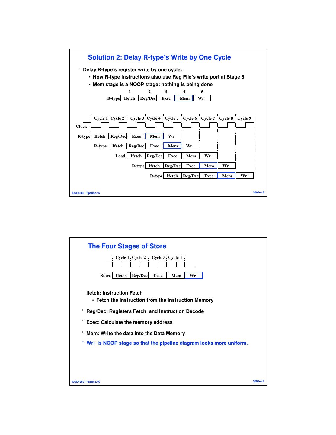 8 . Solution 2: Delay R-type’s Write by One Cycle °Delay R-type’s register write by one cycle: • Now R-type instructions also use Reg File’s write port at Stage 5 • Mem stage is a NOOP stage: nothing is being done 1 2 3 4 5 R-type Ifetch Reg/Dec Exec Mem Wr Cycle 1 Cycle 2 Cycle 3 Cycle 4 Cycle 5 Cycle 6 Cycle 7 Cycle 8 Cycle 9 Clock R-type Ifetch Reg/Dec Exec Mem Wr R-type Ifetch Reg/Dec Exec Mem Wr Load Ifetch Reg/Dec Exec Mem Wr R-type Ifetch Reg/Dec Exec Mem Wr R-type Ifetch Reg/Dec Exec Mem Wr ECE4680 Pipeline.15 2002-4-3 The Four Stages of Store Cycle 1 Cycle 2 Cycle 3 Cycle 4 Store Ifetch Reg/Dec Exec Mem Wr °Ifetch: Instruction Fetch • Fetch the instruction from the Instruction Memory °Reg/Dec: Registers Fetch and Instruction Decode °Exec: Calculate the memory address °Mem: Write the data into the Data Memory °Wr: is NOOP stage so that the pipeline diagram looks more uniform. ECE4680 Pipeline.16 2002-4-3