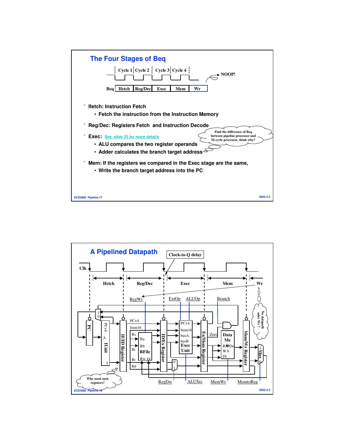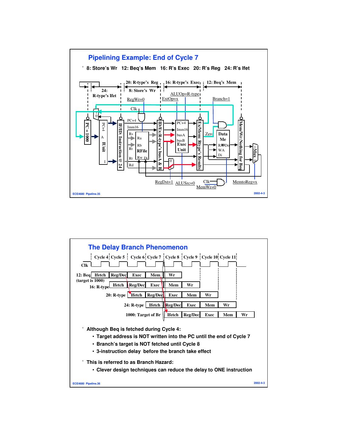 18 . Pipelining Example: End of Cycle 7 °8: Store’s Wr 12: Beq’s Mem 16: R’s Exec 20: R’s Reg 24: R’s Ifet 20: R-type’s Reg 16: R-type’s Exec 12: Beq’s Mem 24: 8: Store’s Wr R-type’s Ifet ALUOp=R-type RegWr=0 ExtOp=x Branch=1 Clk 1 0 PC+4 Mem/Wr:Nothing for Beq ID/Ex:R-type’s busA & B PC+4 Ex/Mem: Rtype’s Results PC = 1000 PC+4 IF/ID: Instruction @ 24 Imm16 Imm16 Rs busA Zero Data A Ra busB Me IUnit Rb Exec mDo RA Rt 1 Unit Mux RFile WA Di Rt Rw Di I 0 0 Rd 1 RegDst=1 ALUSrc=0 Clk MemtoReg=x MemWr=0 ECE4680 Pipeline.35 2002-4-3 The Delay Branch Phenomenon Cycle 4 Cycle 5 Cycle 6 Cycle 7 Cycle 8 Cycle 9 Cycle 10 Cycle 11 Clk 12: Beq Ifetch Reg/Dec Exec Mem Wr (target is 1000) 16: R-type Ifetch Reg/Dec Exec Mem Wr 20: R-type Ifetch Reg/Dec Exec Mem Wr 24: R-type Ifetch Reg/Dec Exec Mem Wr 1000: Target of Br Ifetch Reg/Dec Exec Mem Wr °Although Beq is fetched during Cycle 4: • Target address is NOT written into the PC until the end of Cycle 7 • Branch’s target is NOT fetched until Cycle 8 • 3-instruction delay before the branch take effect °This is referred to as Branch Hazard: • Clever design techniques can reduce the delay to ONE instruction ECE4680 Pipeline.36 2002-4-3