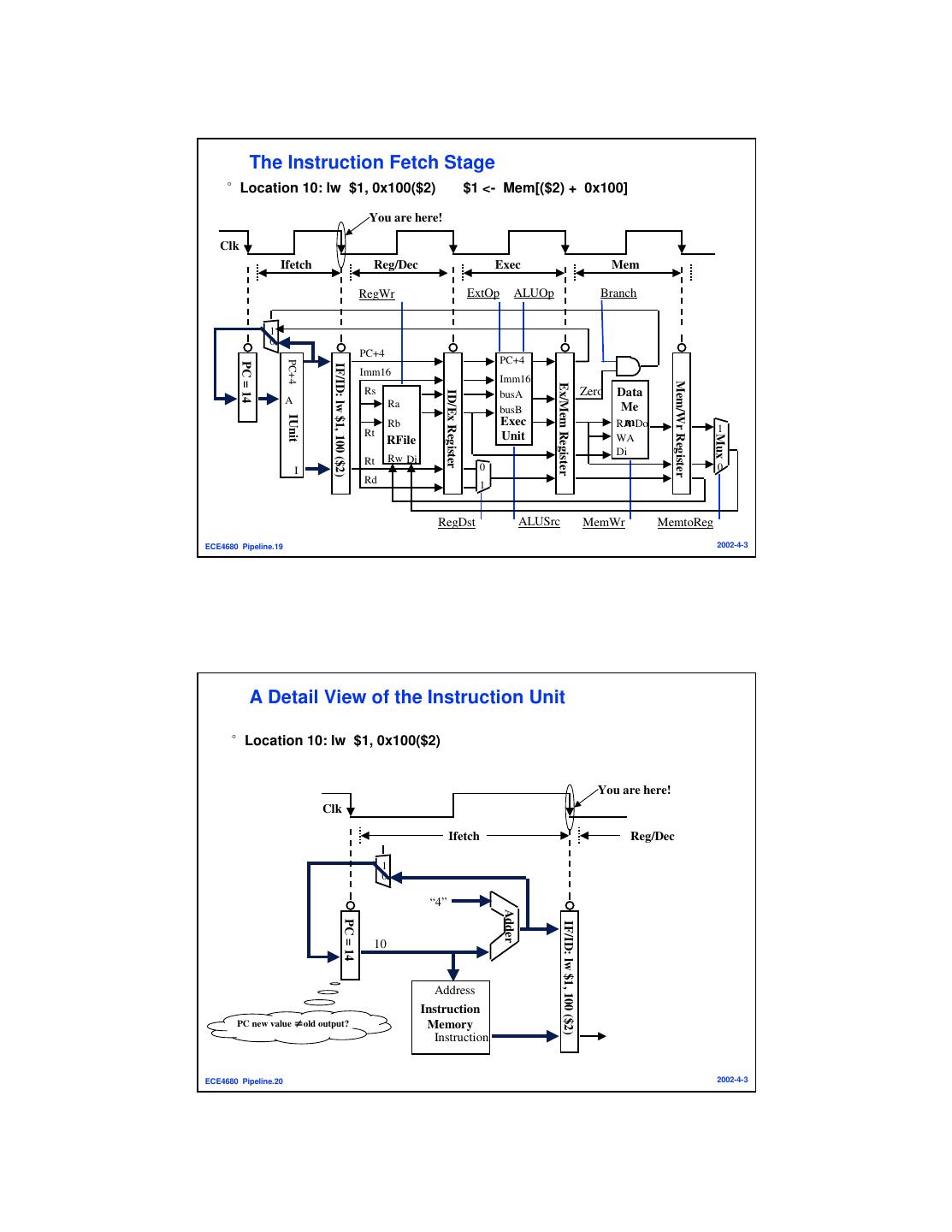 10 . The Instruction Fetch Stage °Location 10: lw $1, 0x100($2) $1 <- Mem[($2) + 0x100] You are here! Clk Ifetch Reg/Dec Exec Mem RegWr ExtOp ALUOp Branch 1 0 PC+4 PC+4 PC+4 PC = 14 IF/ID: lw $1, 100 ($2) Imm16 Imm16 Mem/Wr Register Ex/Mem Register Rs Zero Data ID/Ex Register busA A Ra busB Me IUnit Rb Exec mDo RA Rt 1 Unit Mux RFile WA Di Rt Rw Di I 0 0 Rd 1 RegDst ALUSrc MemWr MemtoReg ECE4680 Pipeline.19 2002-4-3 A Detail View of the Instruction Unit °Location 10: lw $1, 0x100($2) You are here! Clk Ifetch Reg/Dec 1 0 “4” Adder PC = 14 IF/ID: lw $1, 100 ($2) 10 Address Instruction PC new value ≠old output? Memory Instruction ECE4680 Pipeline.20 2002-4-3