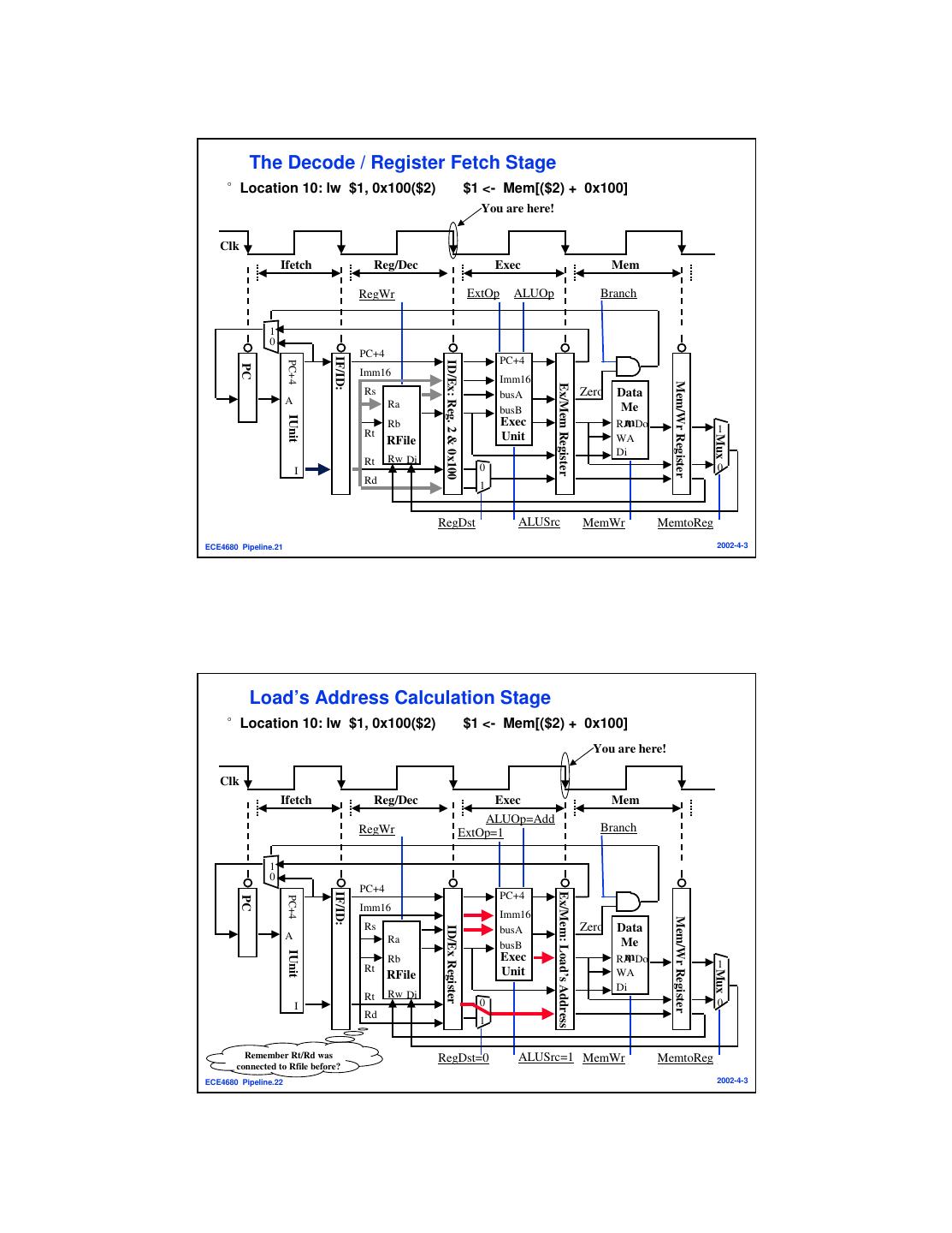 11 . The Decode / Register Fetch Stage °Location 10: lw $1, 0x100($2) $1 <- Mem[($2) + 0x100] You are here! Clk Ifetch Reg/Dec Exec Mem RegWr ExtOp ALUOp Branch 1 0 PC+4 IF/ID: PC+4 PC+4 ID/Ex: Reg. 2 & 0x100 PC Imm16 Imm16 Mem/Wr Register Ex/Mem Register Rs busA Zero Data A Ra busB Me IUnit Rb Exec mDo RA Rt 1 Unit Mux RFile WA Di Rt Rw Di I 0 0 Rd 1 RegDst ALUSrc MemWr MemtoReg ECE4680 Pipeline.21 2002-4-3 Load’s Address Calculation Stage °Location 10: lw $1, 0x100($2) $1 <- Mem[($2) + 0x100] You are here! Clk Ifetch Reg/Dec Exec Mem ALUOp=Add RegWr ExtOp=1 Branch 1 0 PC+4 IF/ID: Ex/Mem: Load’s Address PC+4 PC+4 PC Imm16 Imm16 Mem/Wr Register Rs Zero Data ID/Ex Register busA A Ra busB Me IUnit Rb Exec mDo RA Rt 1 Unit Mux RFile WA Di Rt Rw Di I 0 0 Rd 1 Remember Rt/Rd was RegDst=0 ALUSrc=1 MemWr MemtoReg connected to Rfile before? ECE4680 Pipeline.22 2002-4-3