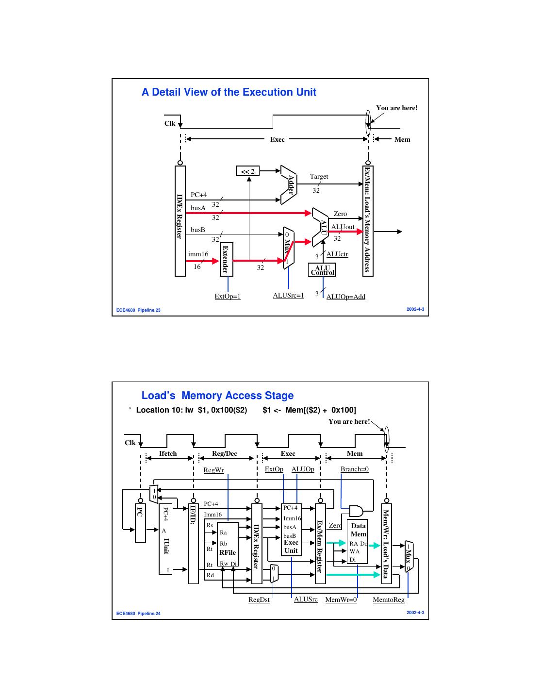 12 . A Detail View of the Execution Unit You are here! Clk Exec Mem Ex/Mem: Load’s Memory Address << 2 Target Adder 32 PC+4 ID/Ex Register busA 32 Zero 32 ALU busB ALUout 0 32 32 Mux Extender imm16 3 ALUctr 1 16 32 ALU Control ExtOp=1 ALUSrc=1 3 ALUOp=Add ECE4680 Pipeline.23 2002-4-3 Load’s Memory Access Stage °Location 10: lw $1, 0x100($2) $1 <- Mem[($2) + 0x100] You are here! Clk Ifetch Reg/Dec Exec Mem RegWr ExtOp ALUOp Branch=0 1 0 PC+4 IF/ID: PC+4 PC+4 PC Mem/Wr: Load’s Data Imm16 Imm16 Ex/Mem Register Rs Zero Data ID/Ex Register busA A Ra busB Mem IUnit Rb Exec RA Do Rt 1 Unit Mux RFile WA Di Rt Rw Di I 0 0 Rd 1 RegDst ALUSrc MemWr=0 MemtoReg ECE4680 Pipeline.24 2002-4-3