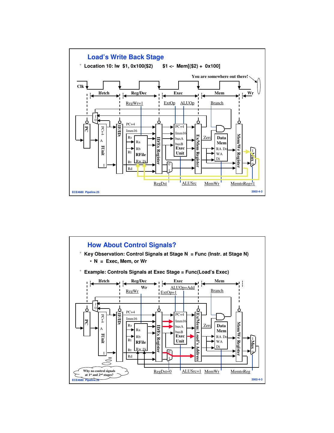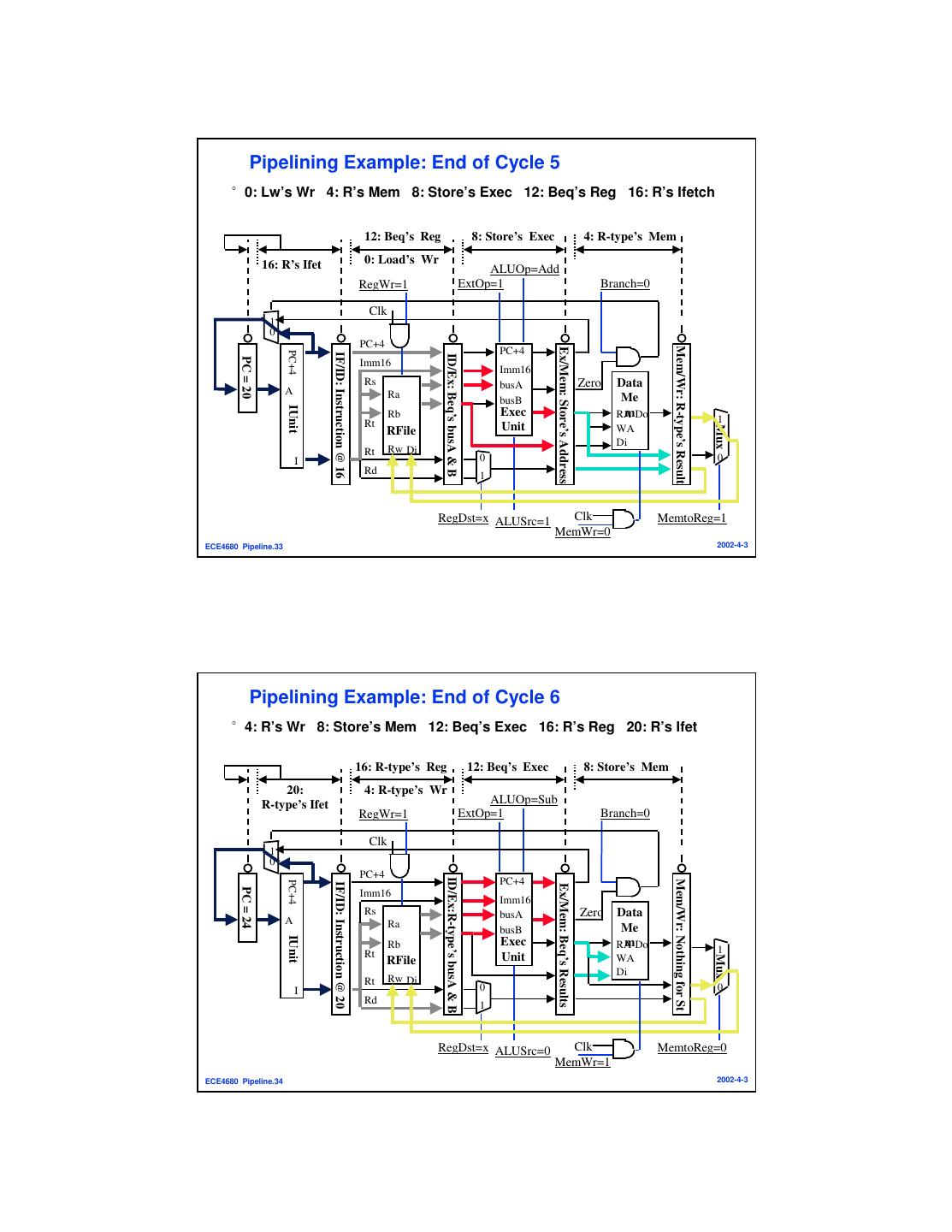 17 . Pipelining Example: End of Cycle 5 °0: Lw’s Wr 4: R’s Mem 8: Store’s Exec 12: Beq’s Reg 16: R’s Ifetch 12: Beq’s Reg 8: Store’s Exec 4: R-type’s Mem 16: R’s Ifet 0: Load’s Wr ALUOp=Add RegWr=1 ExtOp=1 Branch=0 Clk 1 0 PC+4 Mem/Wr: R-type’s Result Ex/Mem: Store’s Address PC+4 PC+4 IF/ID: Instruction @ 16 ID/Ex: Beq’s busA & B PC = 20 Imm16 Imm16 Rs busA Zero Data A Ra busB Me IUnit Rb Exec mDo RA Rt 1 Unit Mux RFile WA Di Rt Rw Di I 0 0 Rd 1 RegDst=x ALUSrc=1 Clk MemtoReg=1 MemWr=0 ECE4680 Pipeline.33 2002-4-3 Pipelining Example: End of Cycle 6 °4: R’s Wr 8: Store’s Mem 12: Beq’s Exec 16: R’s Reg 20: R’s Ifet 16: R-type’s Reg 12: Beq’s Exec 8: Store’s Mem 20: 4: R-type’s Wr R-type’s Ifet ALUOp=Sub RegWr=1 ExtOp=1 Branch=0 Clk 1 0 PC+4 ID/Ex:R-type’s busA & B PC+4 Mem/Wr: Nothing for St PC+4 IF/ID: Instruction @ 20 Ex/Mem: Beq’s Results PC = 24 Imm16 Imm16 Rs busA Zero Data A Ra busB Me IUnit Rb Exec mDo RA Rt 1 Unit Mux RFile WA Di Rt Rw Di I 0 0 Rd 1 RegDst=x ALUSrc=0 Clk MemtoReg=0 MemWr=1 ECE4680 Pipeline.34 2002-4-3
