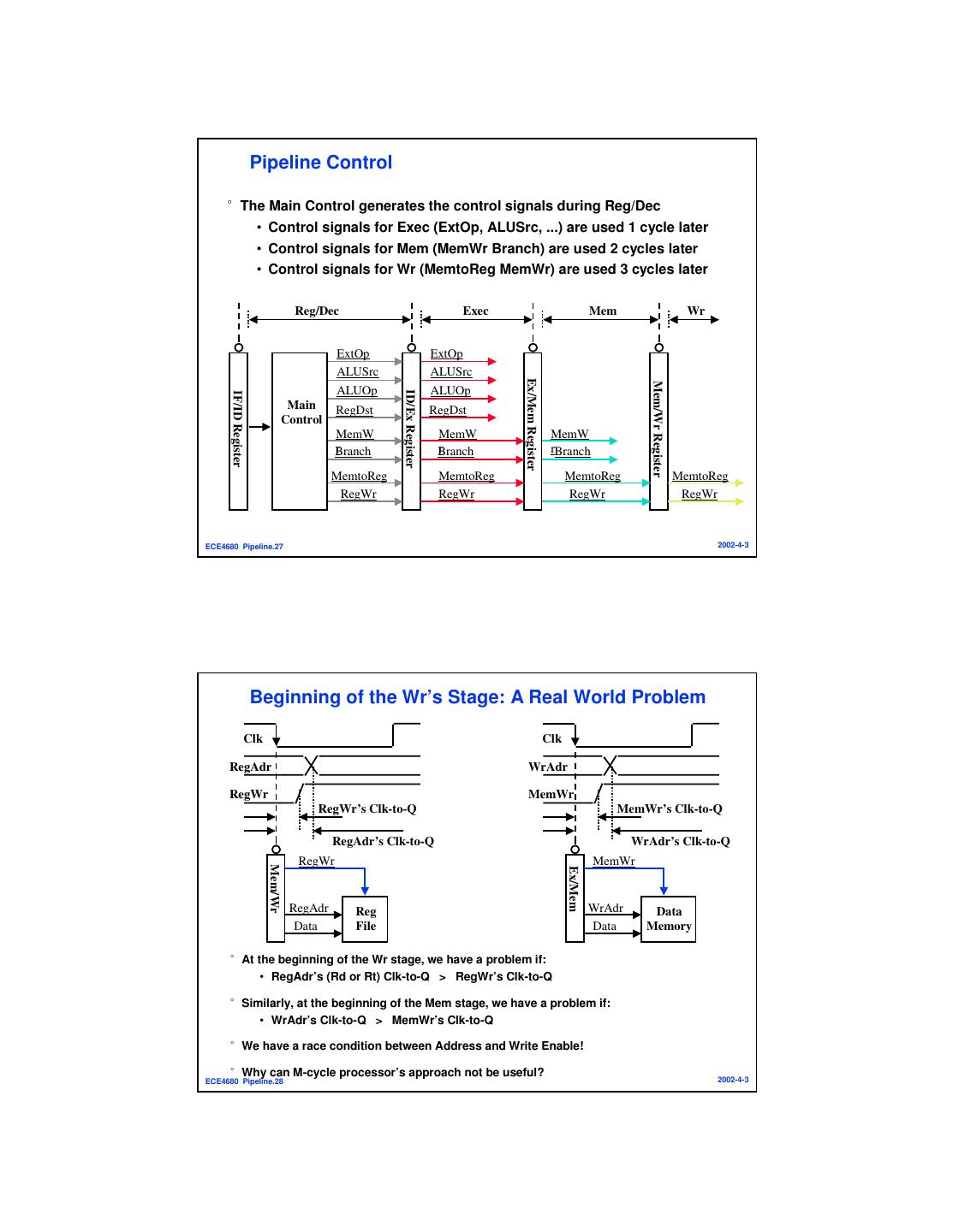 14 . Pipeline Control °The Main Control generates the control signals during Reg/Dec • Control signals for Exec (ExtOp, ALUSrc, ...) are used 1 cycle later • Control signals for Mem (MemWr Branch) are used 2 cycles later • Control signals for Wr (MemtoReg MemWr) are used 3 cycles later Reg/Dec Exec Mem Wr ExtOp ExtOp ALUSrc ALUSrc Ex/Mem Register Mem/Wr Register ALUOp ALUOp ID/Ex Register IF/ID Register Main RegDst RegDst Control MemW MemW MemW r Branch r Branch rBranch MemtoReg MemtoReg MemtoReg MemtoReg RegWr RegWr RegWr RegWr ECE4680 Pipeline.27 2002-4-3 Beginning of the Wr’s Stage: A Real World Problem Clk Clk RegAdr WrAdr RegWr MemWr RegWr’s Clk-to-Q MemWr’s Clk-to-Q RegAdr’s Clk-to-Q WrAdr’s Clk-to-Q RegWr MemWr Mem/Wr Ex/Mem RegAdr Reg WrAdr Data Data File Data Memory °At the beginning of the Wr stage, we have a problem if: • RegAdr’s (Rd or Rt) Clk-to-Q > RegWr’s Clk-to-Q °Similarly, at the beginning of the Mem stage, we have a problem if: • WrAdr’s Clk-to-Q > MemWr’s Clk-to-Q °We have a race condition between Address and Write Enable! °Why can M-cycle processor’s approach not be useful? ECE4680 Pipeline.28 2002-4-3