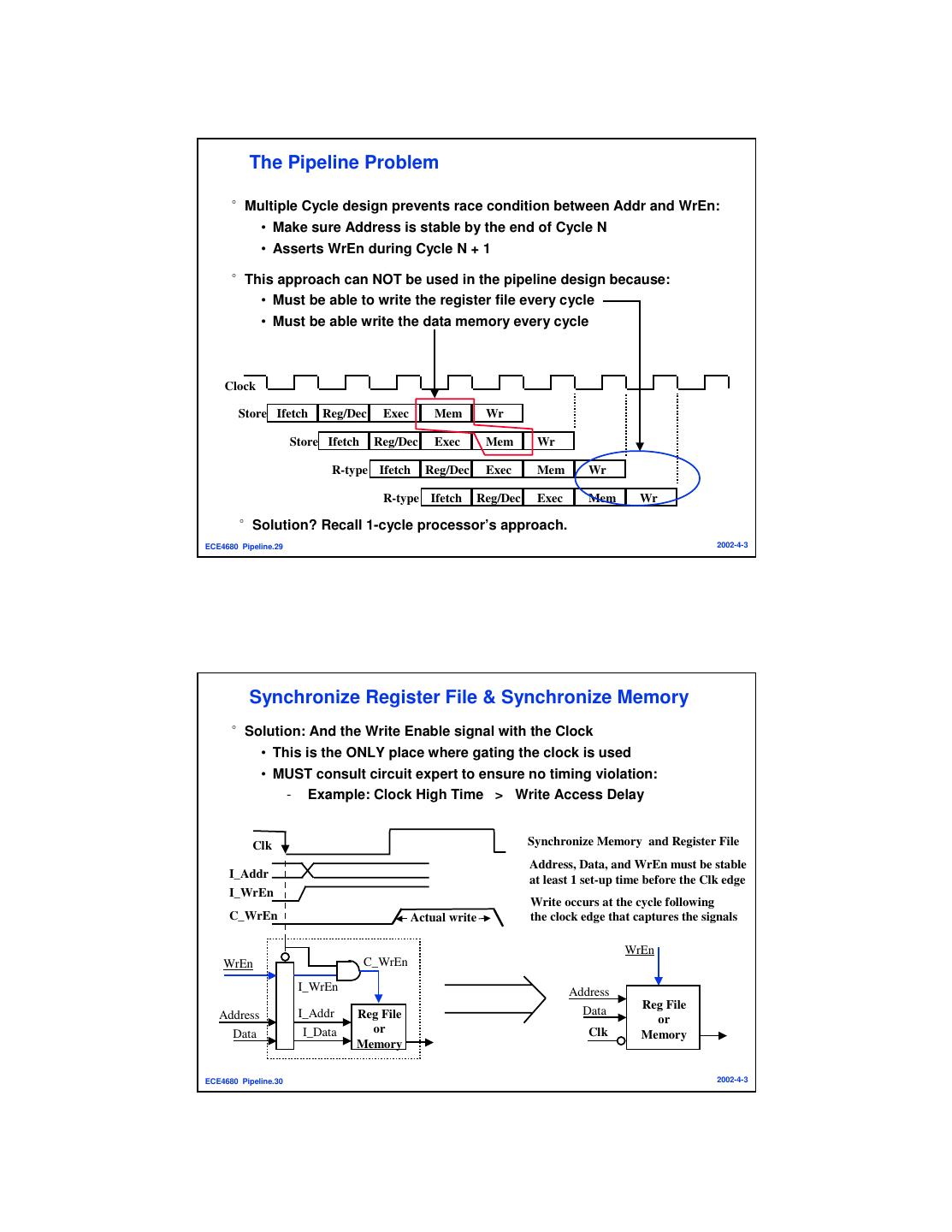 15 . The Pipeline Problem °Multiple Cycle design prevents race condition between Addr and WrEn: • Make sure Address is stable by the end of Cycle N • Asserts WrEn during Cycle N + 1 °This approach can NOT be used in the pipeline design because: • Must be able to write the register file every cycle • Must be able write the data memory every cycle Clock Store Ifetch Reg/Dec Exec Mem Wr Store Ifetch Reg/Dec Exec Mem Wr R-type Ifetch Reg/Dec Exec Mem Wr R-type Ifetch Reg/Dec Exec Mem Wr °Solution? Recall 1-cycle processor’s approach. ECE4680 Pipeline.29 2002-4-3 Synchronize Register File & Synchronize Memory °Solution: And the Write Enable signal with the Clock • This is the ONLY place where gating the clock is used • MUST consult circuit expert to ensure no timing violation: - Example: Clock High Time > Write Access Delay Clk Synchronize Memory and Register File Address, Data, and WrEn must be stable I_Addr at least 1 set-up time before the Clk edge I_WrEn Write occurs at the cycle following C_WrEn Actual write the clock edge that captures the signals WrEn WrEn C_WrEn I_WrEn Address Data Reg File Address I_Addr Reg File or Data I_Data or Clk Memory Memory ECE4680 Pipeline.30 2002-4-3