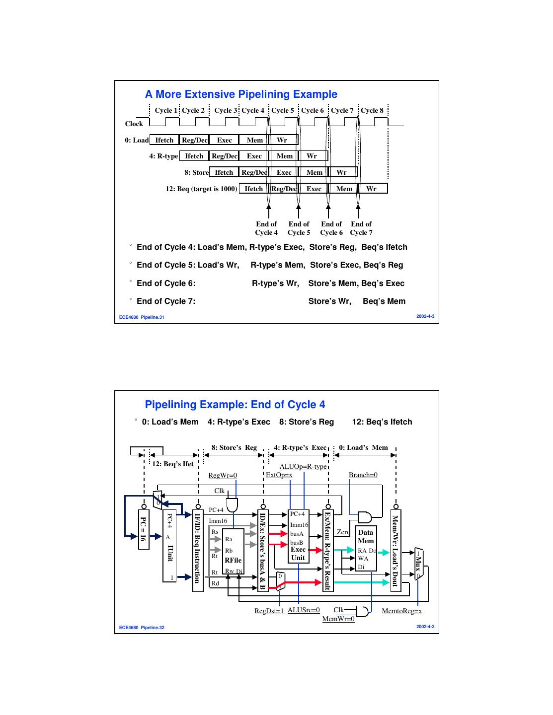 16 . A More Extensive Pipelining Example Cycle 1 Cycle 2 Cycle 3 Cycle 4 Cycle 5 Cycle 6 Cycle 7 Cycle 8 Clock 0: Load Ifetch Reg/Dec Exec Mem Wr 4: R-type Ifetch Reg/Dec Exec Mem Wr 8: Store Ifetch Reg/Dec Exec Mem Wr 12: Beq (target is 1000) Ifetch Reg/Dec Exec Mem Wr End of End of End of End of Cycle 4 Cycle 5 Cycle 6 Cycle 7 °End of Cycle 4: Load’s Mem, R-type’s Exec, Store’s Reg, Beq’s Ifetch °End of Cycle 5: Load’s Wr, R-type’s Mem, Store’s Exec, Beq’s Reg °End of Cycle 6: R-type’s Wr, Store’s Mem, Beq’s Exec °End of Cycle 7: Store’s Wr, Beq’s Mem ECE4680 Pipeline.31 2002-4-3 Pipelining Example: End of Cycle 4 °0: Load’s Mem 4: R-type’s Exec 8: Store’s Reg 12: Beq’s Ifetch 8: Store’s Reg 4: R-type’s Exec 0: Load’s Mem 12: Beq’s Ifet ALUOp=R-type RegWr=0 ExtOp=x Branch=0 Clk 1 0 PC+4 PC+4 Ex/Mem: R-type’s Result ID/Ex: Store’s busA & B PC+4 IF/ID: Beq Instruction Mem/Wr: Load’s Dout PC = 16 Imm16 Imm16 Rs busA Zero Data A Ra busB Mem IUnit Rb Exec RA Do Rt 1 Unit Mux RFile WA Di Rt Rw Di I 0 0 Rd 1 RegDst=1 ALUSrc=0 Clk MemtoReg=x MemWr=0 ECE4680 Pipeline.32 2002-4-3