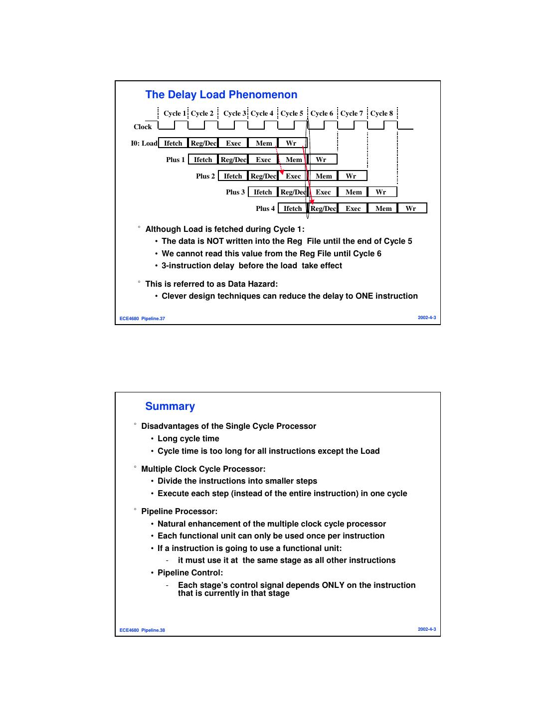 19 . The Delay Load Phenomenon Cycle 1 Cycle 2 Cycle 3 Cycle 4 Cycle 5 Cycle 6 Cycle 7 Cycle 8 Clock I0: Load Ifetch Reg/Dec Exec Mem Wr Plus 1 Ifetch Reg/Dec Exec Mem Wr Plus 2 Ifetch Reg/Dec Exec Mem Wr Plus 3 Ifetch Reg/Dec Exec Mem Wr Plus 4 Ifetch Reg/Dec Exec Mem Wr °Although Load is fetched during Cycle 1: • The data is NOT written into the Reg File until the end of Cycle 5 • We cannot read this value from the Reg File until Cycle 6 • 3-instruction delay before the load take effect °This is referred to as Data Hazard: • Clever design techniques can reduce the delay to ONE instruction ECE4680 Pipeline.37 2002-4-3 Summary °Disadvantages of the Single Cycle Processor • Long cycle time • Cycle time is too long for all instructions except the Load °Multiple Clock Cycle Processor: • Divide the instructions into smaller steps • Execute each step (instead of the entire instruction) in one cycle °Pipeline Processor: • Natural enhancement of the multiple clock cycle processor • Each functional unit can only be used once per instruction • If a instruction is going to use a functional unit: - it must use it at the same stage as all other instructions • Pipeline Control: - Each stage’s control signal depends ONLY on the instruction that is currently in that stage ECE4680 Pipeline.38 2002-4-3
