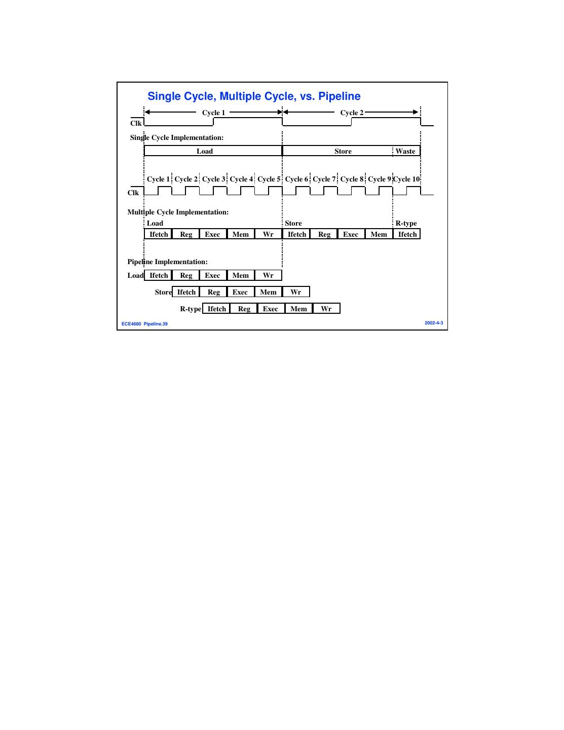 20 . Single Cycle, Multiple Cycle, vs. Pipeline Cycle 1 Cycle 2 Clk Single Cycle Implementation: Load Store Waste Cycle 1 Cycle 2 Cycle 3 Cycle 4 Cycle 5 Cycle 6 Cycle 7 Cycle 8 Cycle 9 Cycle 10 Clk Multiple Cycle Implementation: Load Store R-type Ifetch Reg Exec Mem Wr Ifetch Reg Exec Mem Ifetch Pipeline Implementation: Load Ifetch Reg Exec Mem Wr Store Ifetch Reg Exec Mem Wr R-type Ifetch Reg Exec Mem Wr ECE4680 Pipeline.39 2002-4-3