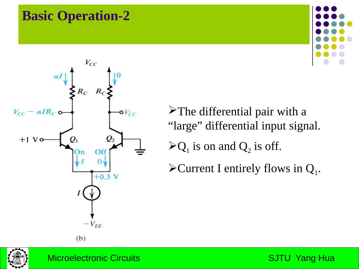 7 .Basic Operation-2 The differential pair with a “large” differential input signal. Q 1 is on and Q 2 is off. Current I entirely flows in Q 1 .