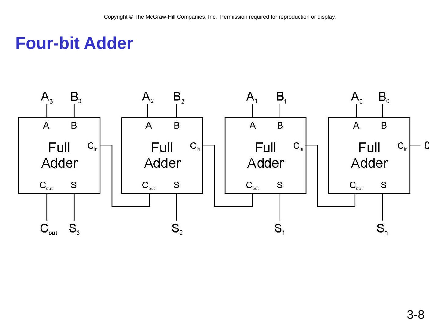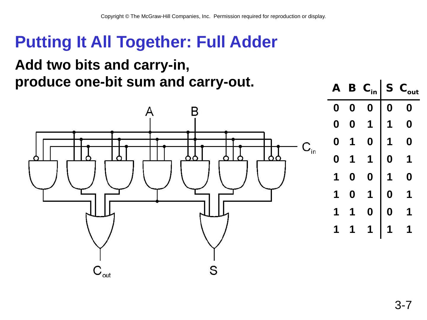 7 .3- 7 Putting It All Together: Full Adder Add two bits and carry-in , produce one-bit sum and carry-out. A B C in S C out 0 0 0 0 0 0 0 1 1 0 0 1 0 1 0 0 1 1 0 1 1 0 0 1 0 1 0 1 0 1 1 1 0 0 1 1 1 1 1 1