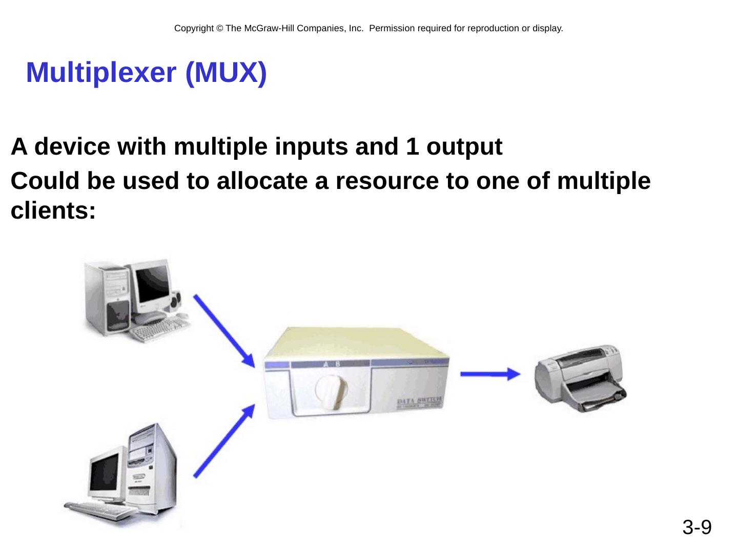 9 .Multiplexer (MUX) A device with multiple inputs and 1 output Could be used to allocate a resource to one of multiple clients: 3- 9