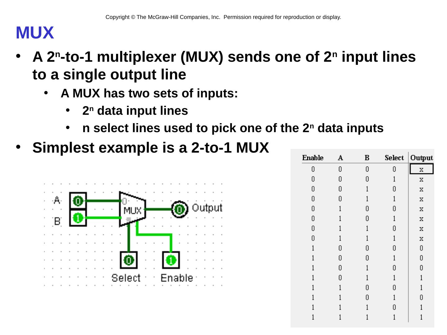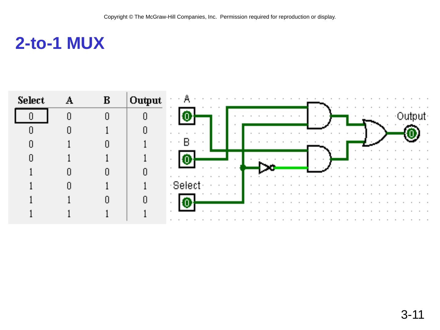 10 .MUX A 2 n -to-1 multiplexer (MUX) sends one of 2 n input lines to a single output line A MUX has two sets of inputs: 2 n data input lines n select lines used to pick one of the 2 n data inputs Simplest example is a 2-to-1 MUX 3- 10