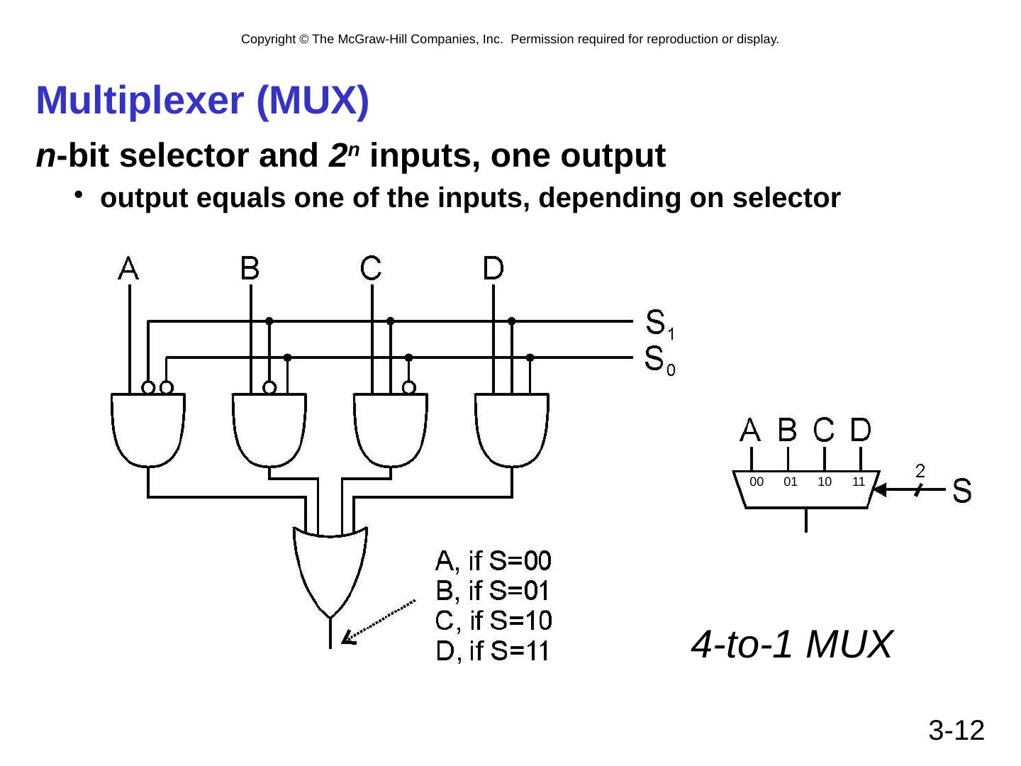 12 .3- 12 Multiplexer (MUX) n -bit selector and 2 n inputs, one output output equals one of the inputs, depending on selector 4-to-1 MUX 00 01 10 11