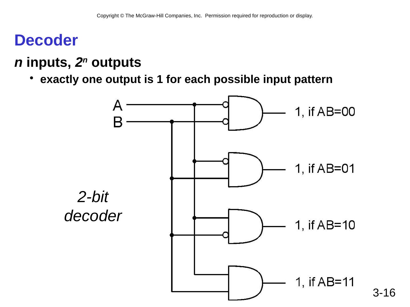 16 .3- 16 Decoder n inputs, 2 n outputs exactly one output is 1 for each possible input pattern 2-bit decoder