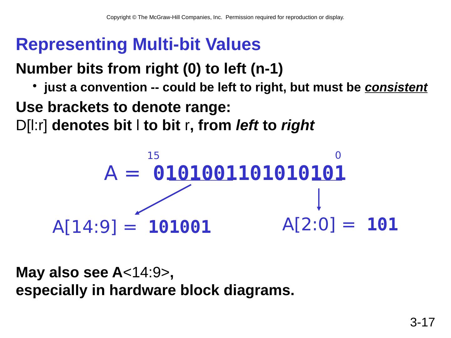 17 .3- 17 Representing Multi-bit Values Number bits from right (0) to left (n-1) just a convention -- could be left to right, but must be consistent Use brackets to denote range: D[l:r] denotes bit l to bit r , from left to right May also see A <14:9> , especially in hardware block diagrams. A = 0101001101010101 A[2:0] = 101 A[14:9] = 101001 0 15