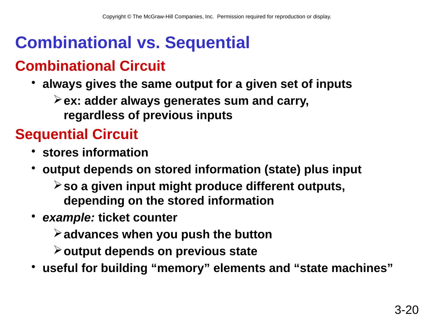 20 .3- 20 Combinational vs. Sequential Combinational Circuit always gives the same output for a given set of inputs ex: adder always generates sum and carry, regardless of previous inputs Sequential Circuit stores information output depends on stored information (state) plus input so a given input might produce different outputs, depending on the stored information example: ticket counter advances when you push the button output depends on previous state useful for building “memory” elements and “state machines”