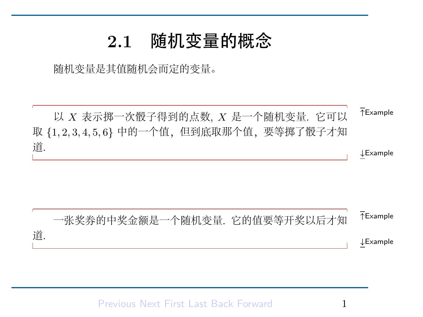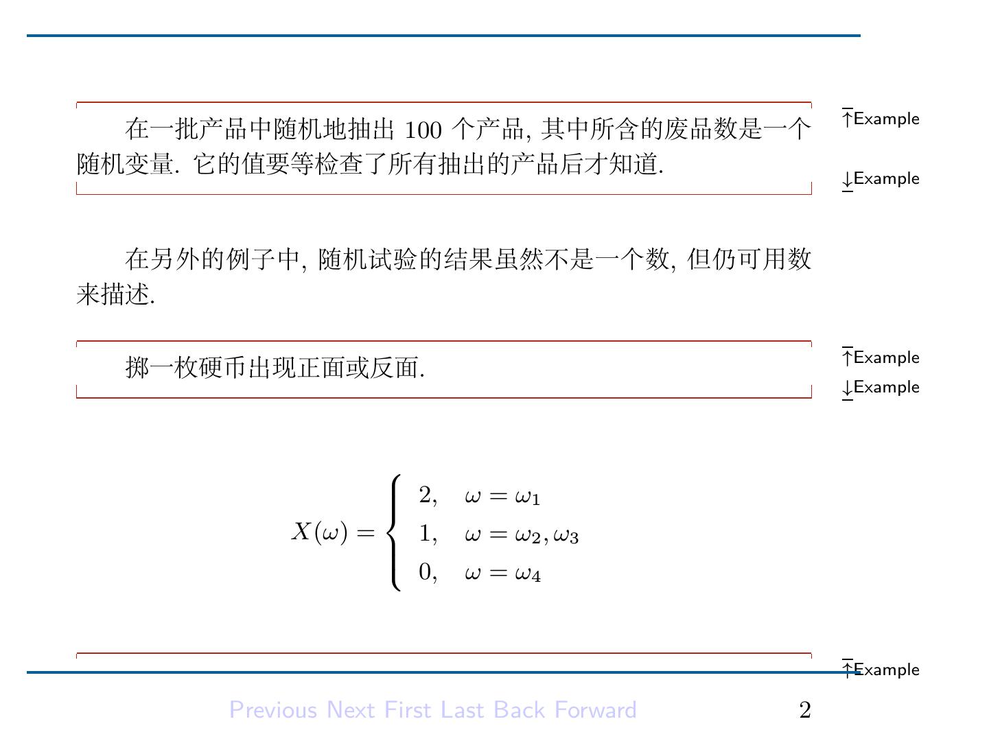 4 . ↑Example 在一批产品中随机地抽出 100 个产品, 其中所含的废品数是一个 随机变量. 它的值要等检查了所有抽出的产品后才知道. ↓Example 在另外的例子中, 随机试验的结果虽然不是一个数, 但仍可用数 来描述. ↑Example 掷一枚硬币出现正面或反面. ↓Example 2, ω = ω1 X(ω) = 1, ω = ω2 , ω3 0, ω = ω4 ↑Example Previous Next First Last Back Forward 2