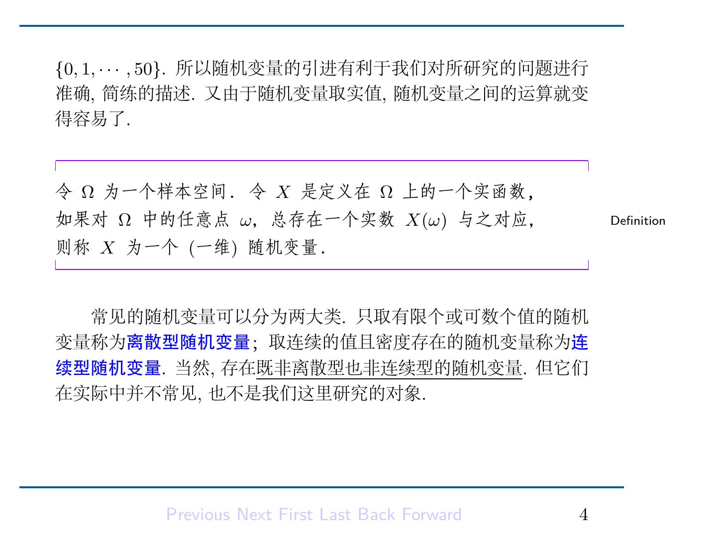 6 .{0, 1, · · · , 50}. 所以随机变量的引进有利于我们对所研究的问题进行 准确, 简练的描述. 又由于随机变量取实值, 随机变量之间的运算就变 得容易了. 令 Ω 为一个样本空间. 令 X 是定义在 Ω 上的一个实函数, 如果对 Ω 中的任意点 ω,总存在一个实数 X(ω) 与之对应, Definition 则称 X 为一个 (一维) 随机变量. 常见的随机变量可以分为两大类. 只取有限个或可数个值的随机 变量称为离散型随机变量;取连续的值且密度存在的随机变量称为连 续型随机变量. 当然, 存在既非离散型也非连续型的随机变量. 但它们 在实际中并不常见, 也不是我们这里研究的对象. Previous Next First Last Back Forward 4