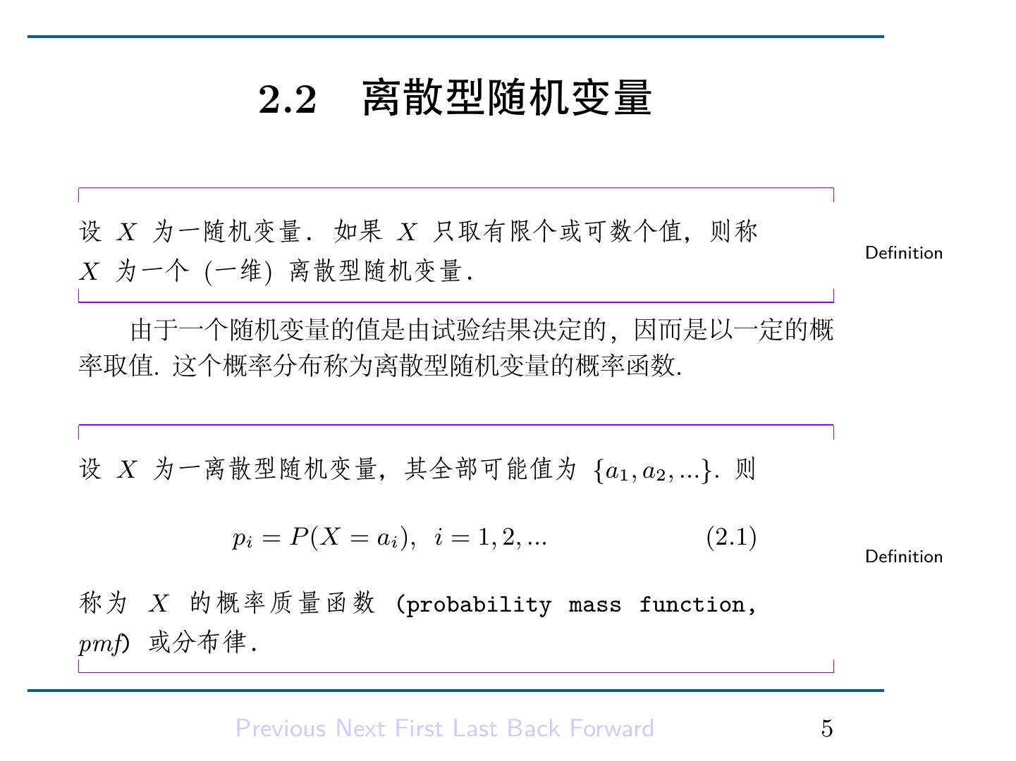 7 . 2.2 离散型随机变量 设 X 为一随机变量. 如果 X 只取有限个或可数个值,则称 Definition X 为一个 (一维) 离散型随机变量. 由于一个随机变量的值是由试验结果决定的,因而是以一定的概 率取值. 这个概率分布称为离散型随机变量的概率函数. 设 X 为一离散型随机变量,其全部可能值为 {a1 , a2 , ...}. 则 pi = P (X = ai ), i = 1, 2, ... (2.1) Definition 称为 X 的概率质量函数 (probability mass function, pmf) 或分布律. Previous Next First Last Back Forward 5