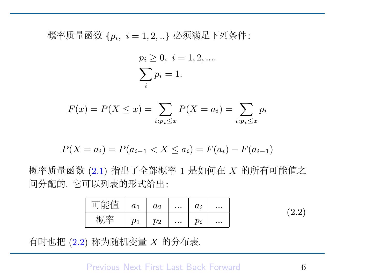 8 . 概率质量函数 {pi , i = 1, 2, ..} 必须满足下列条件: pi ≥ 0, i = 1, 2, .... ∑ pi = 1. i ∑ ∑ F (x) = P (X ≤ x) = P (X = ai ) = pi i:pi ≤x i:pi ≤x P (X = ai ) = P (ai−1 < X ≤ ai ) = F (ai ) − F (ai−1 ) 概率质量函数 (2.1) 指出了全部概率 1 是如何在 X 的所有可能值之 间分配的. 它可以列表的形式给出: 可能值 a1 a2 ... ai ... (2.2) 概率 p1 p2 ... pi ... 有时也把 (2.2) 称为随机变量 X 的分布表. Previous Next First Last Back Forward 6