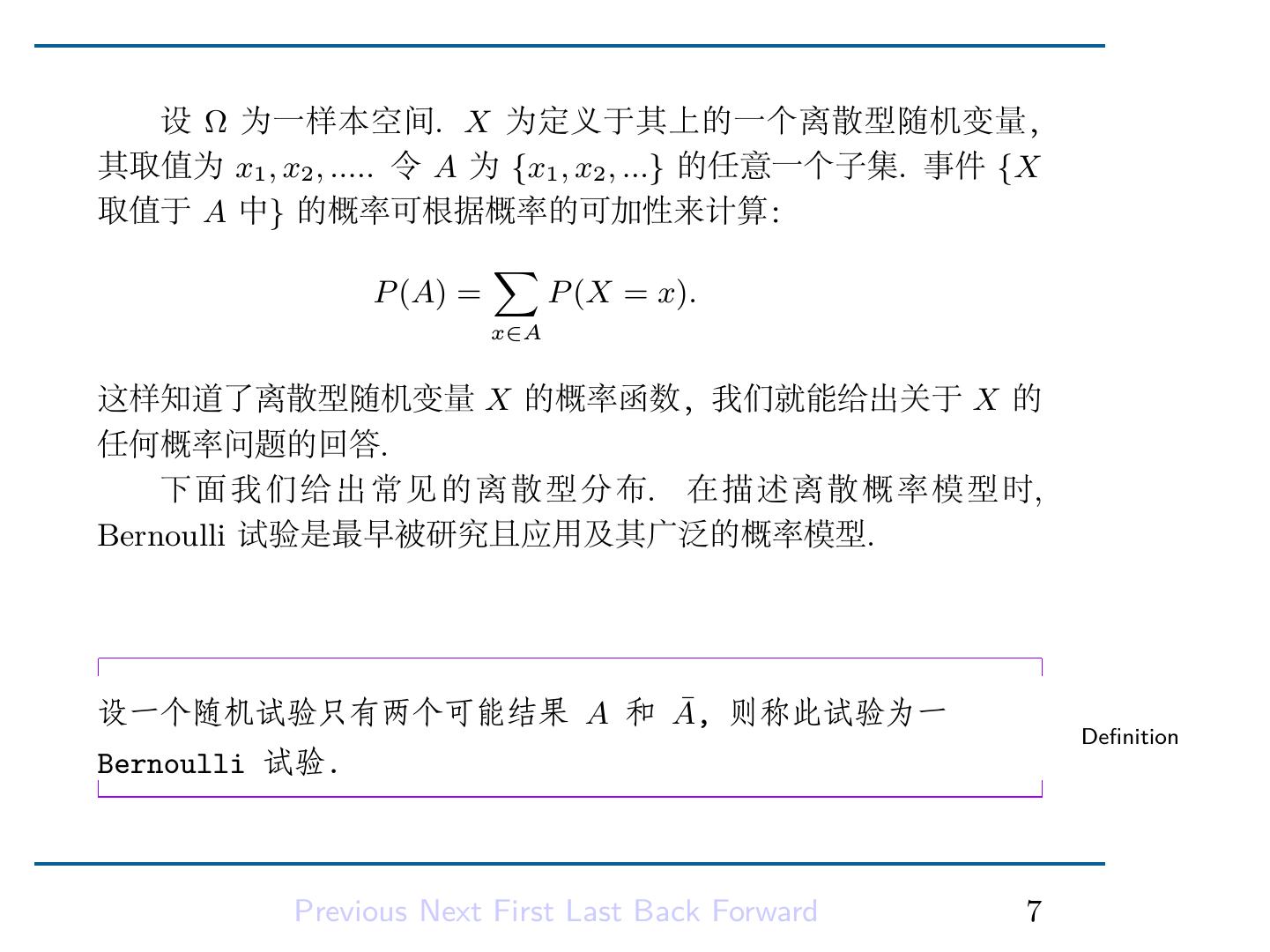 9 . 设 Ω 为一样本空间. X 为定义于其上的一个离散型随机变量, 其取值为 x1 , x2 , ..... 令 A 为 {x1 , x2 , ...} 的任意一个子集. 事件 {X 取值于 A 中} 的概率可根据概率的可加性来计算: ∑ P (A) = P (X = x). x∈A 这样知道了离散型随机变量 X 的概率函数,我们就能给出关于 X 的 任何概率问题的回答. 下 面 我 们 给 出 常 见 的 离 散 型 分 布. 在 描 述 离 散 概 率 模 型 时, Bernoulli 试验是最早被研究且应用及其广泛的概率模型. ¯ 则称此试验为一 设一个随机试验只有两个可能结果 A 和 A, Definition Bernoulli 试验. Previous Next First Last Back Forward 7
