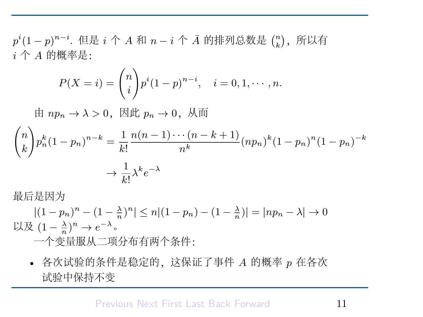 13 . ( ) pi (1 − p)n−i . 但是 i 个 A 和 n − i 个 A¯ 的排列总数是 nk ,所以有 i 个 A 的概率是: ( ) n i P (X = i) = p (1 − p)n−i , i = 0, 1, · · · , n. i 由 npn → λ > 0,因此 pn → 0,从而 ( ) n k 1 n(n − 1) · · · (n − k + 1) pn (1 − pn )n−k = (npn )k (1 − pn )n (1 − pn )−k k k! nk 1 k −λ → λ e k! 最后是因为 |(1 − pn )n − (1 − n ) | ≤ n|(1 − pn ) − (1 − n λ n λ )| = |npn − λ| → 0 −λ 以及 (1 − n ) → e 。 λ n 一个变量服从二项分布有两个条件: • 各次试验的条件是稳定的,这保证了事件 A 的概率 p 在各次 试验中保持不变 Previous Next First Last Back Forward 11