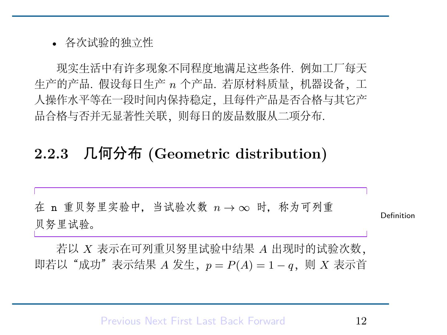 10 .设将一个可能结果为 A 和 A¯ 的 Bernoulli 试验独立地重 复 n 次, 使得事件 A 每次出现的概率相同, 则称此试验为 Definition n 重 Bernoulli 试验. 下面的 0-1 分布和二项分布都是以 Bernoulli 试验为基础的. 2.2.1 0-1 分布 设随机变量 X 只取 0,1 两值,P (X = 1) = p,P (X = 0) = 1 − p,则称 X 服从 0-1 分布或 Bernoulli 分布. 0-1 分布是很多古典 概率模型的基础. Previous Next First Last Back Forward 8