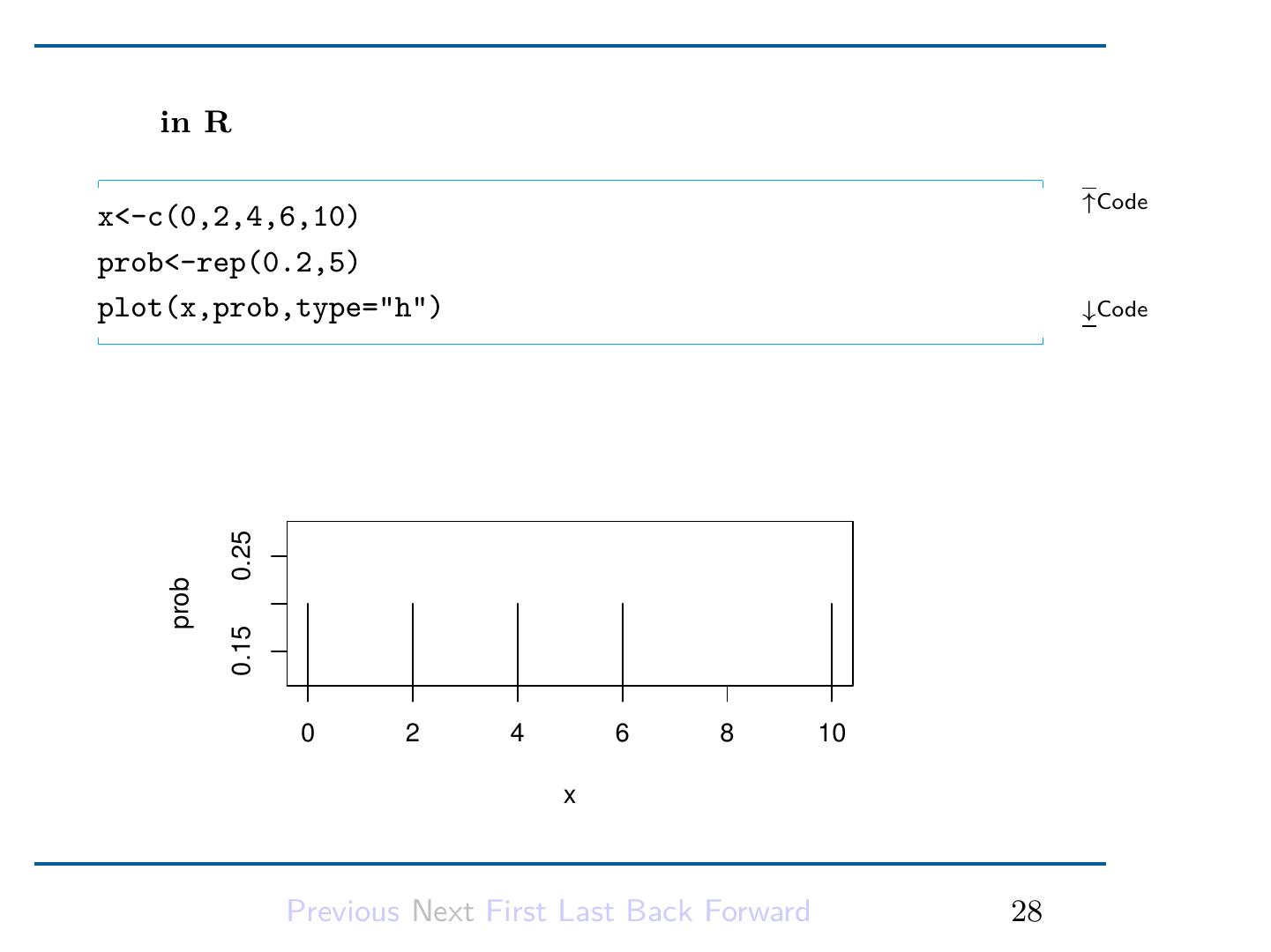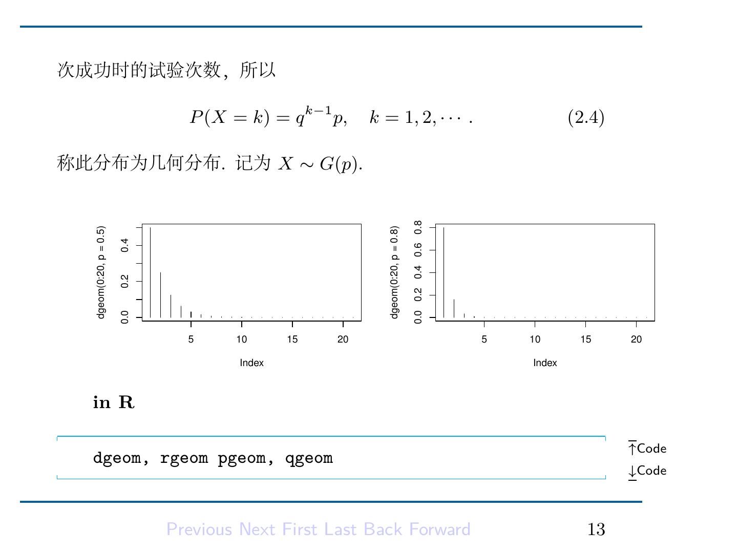 15 .次成功时的试验次数,所以 P (X = k) = q k−1 p, k = 1, 2, · · · . (2.4) 称此分布为几何分布. 记为 X ∼ G(p). 0.0 0.2 0.4 0.6 0.8 dgeom(0:20, p = 0.5) dgeom(0:20, p = 0.8) 0.4 0.2 0.0 5 10 15 20 5 10 15 20 Index Index in R ↑Code dgeom, rgeom pgeom, qgeom ↓Code Previous Next First Last Back Forward 13