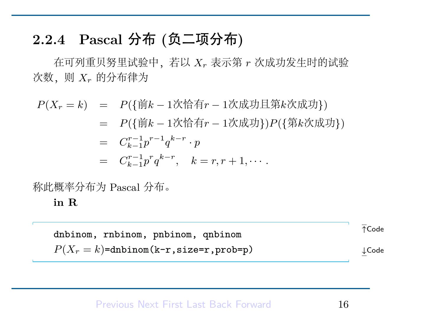 18 .2.2.4 Pascal 分布 (负二项分布) 在可列重贝努里试验中,若以 Xr 表示第 r 次成功发生时的试验 次数,则 Xr 的分布律为 P (Xr = k) = P ({前k − 1次恰有r − 1次成功且第k次成功}) = P ({前k − 1次恰有r − 1次成功})P ({第k次成功}) = r−1 r−1 k−r Ck−1 p q ·p = r−1 r k−r Ck−1 p q , k = r, r + 1, · · · . 称此概率分布为 Pascal 分布。 in R ↑Code dnbinom, rnbinom, pnbinom, qnbinom P (Xr = k)=dnbinom(k-r,size=r,prob=p) ↓Code Previous Next First Last Back Forward 16